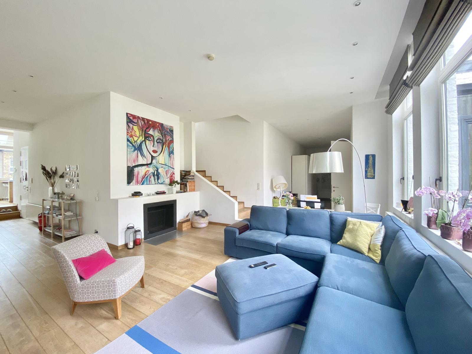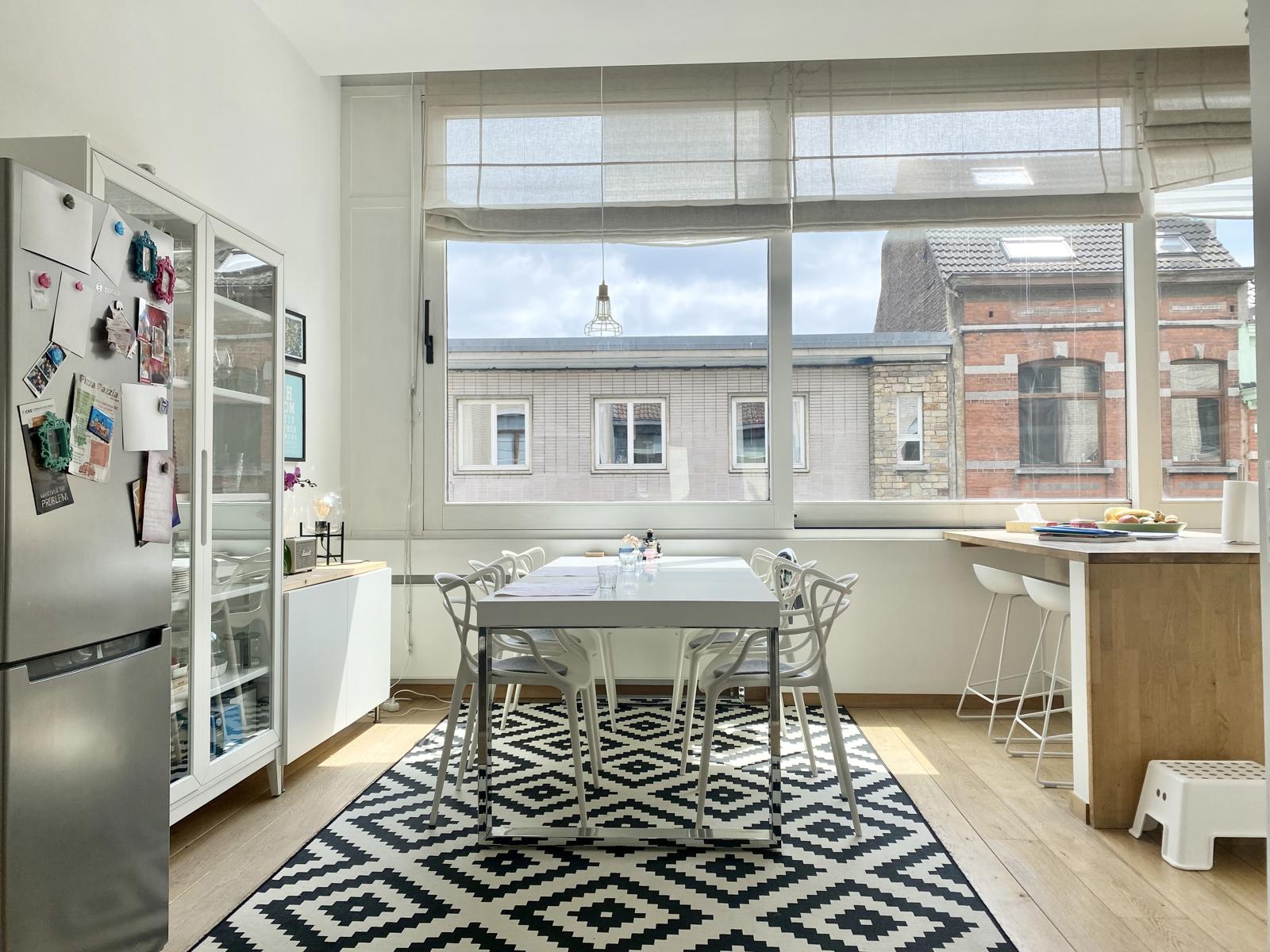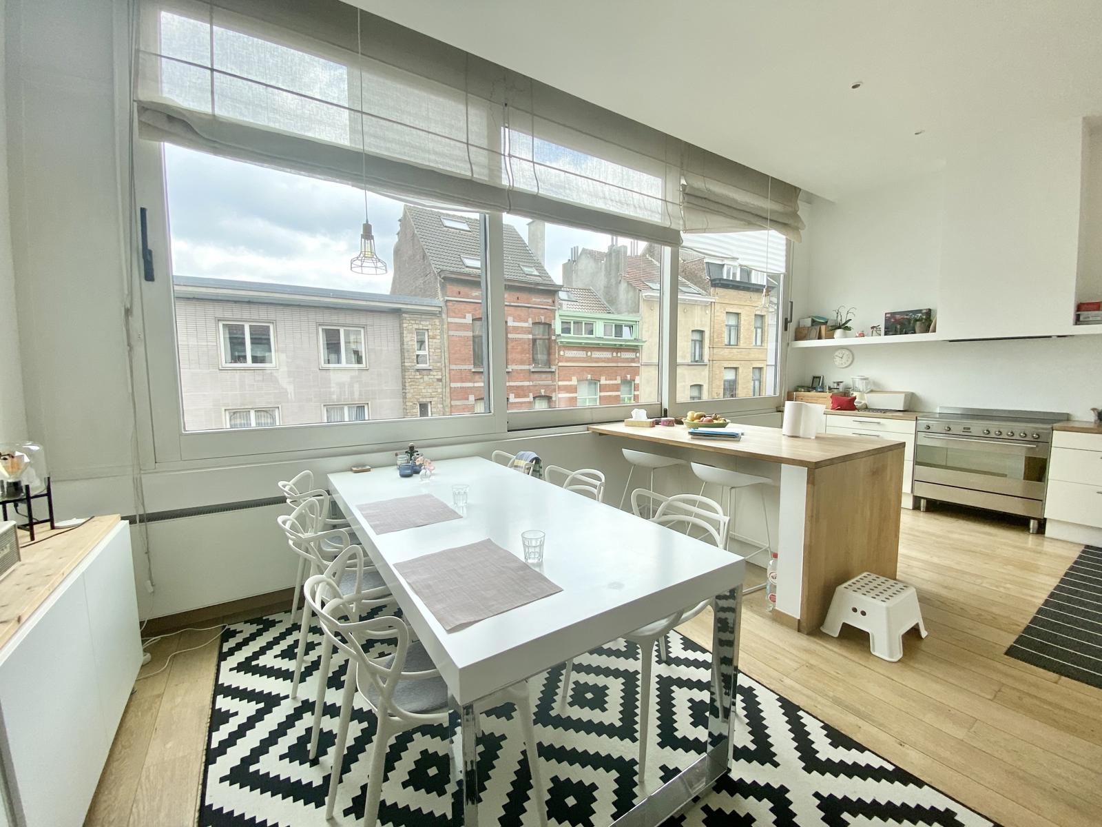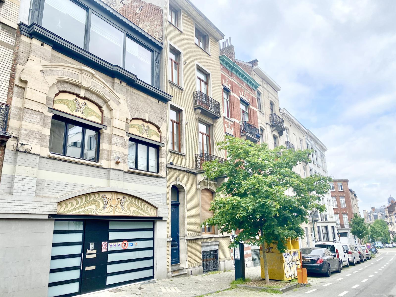 Victoire-Junot Presents : Saint-Gilles, in a mansion built in 1928, duplex apartment of 250 m² living space, located on the 2nd&3rd floor, completely renovated, including living room, open fire, parquet floor, TV room or library, super-equipped Smeg kitchen, separate laundry room, 3 bedrooms +office, bathroom, shower room, teak terrace (lighted) and bamboo plantation, embedded spotlights, double glazing everywhere, armored door, alarm, videophone, parking space : 150 euros, cellar