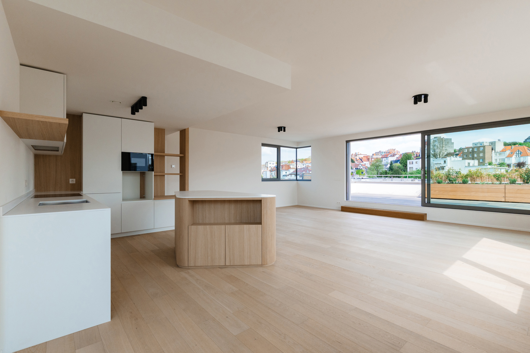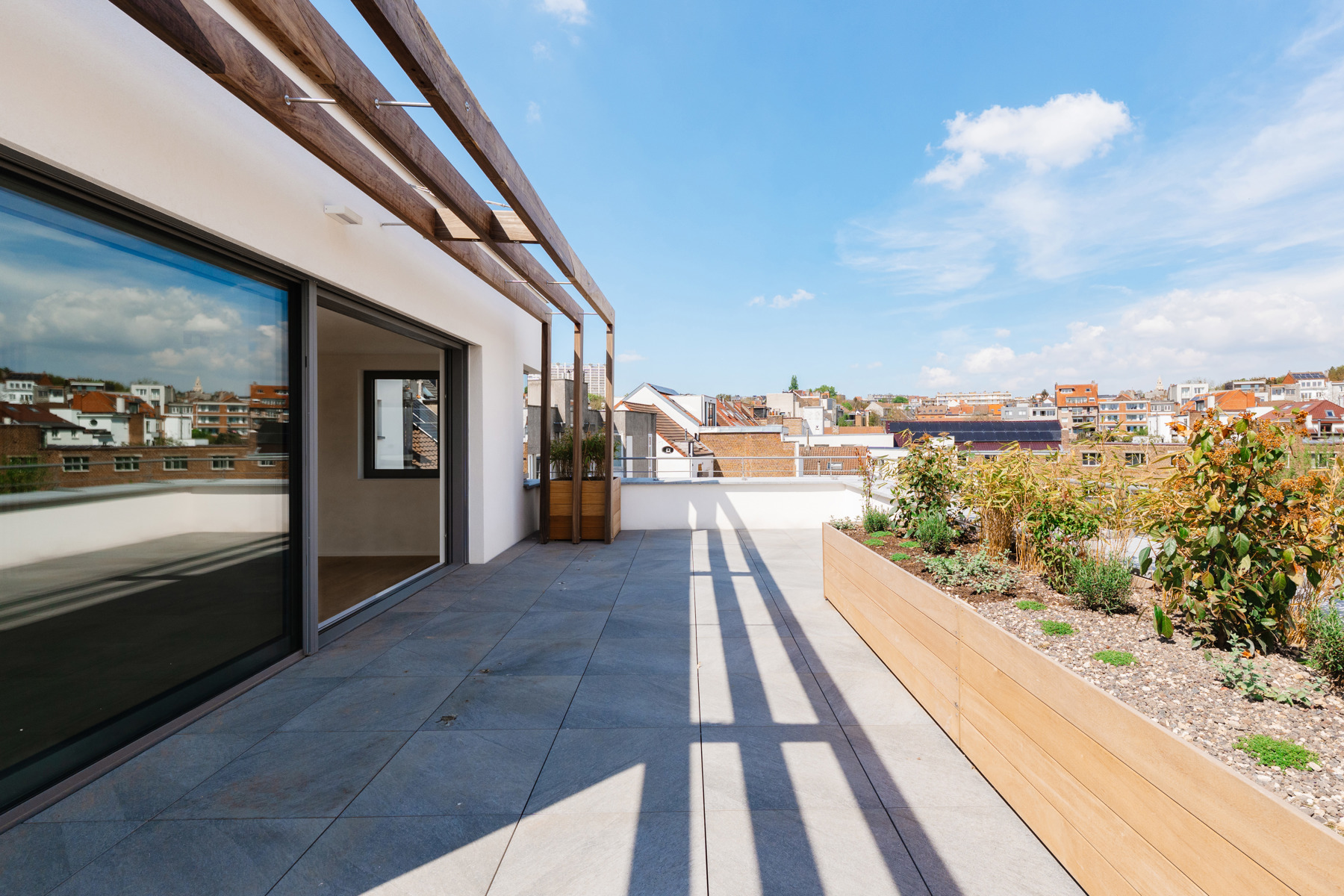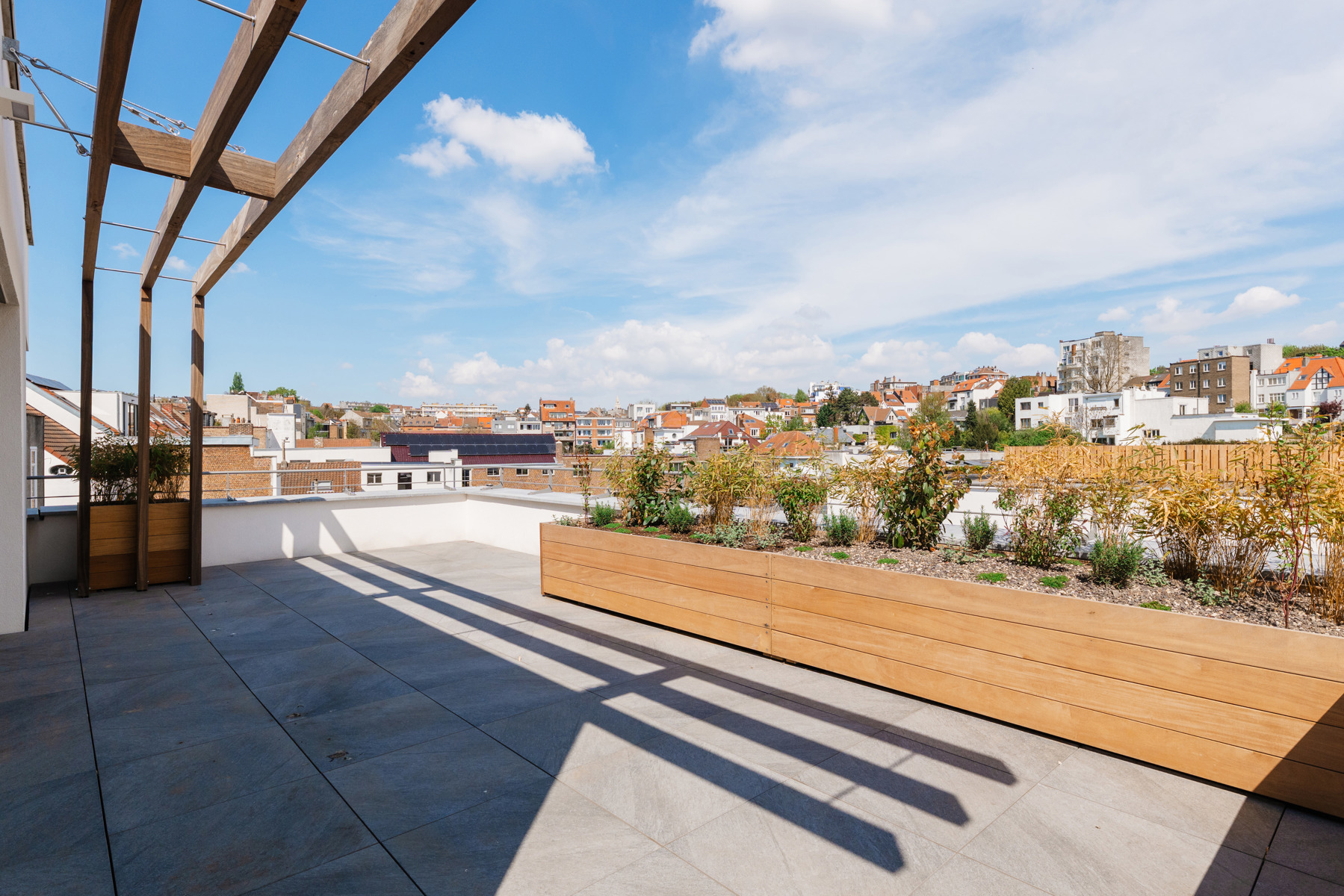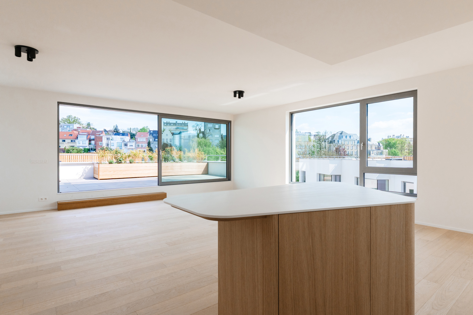 VICTOIRE Junot is pleased to present this splendid penthouse, spacious, bright, and uniquely designed, pleasantly overlooking the Carré Coghen development. Ideally located in the heart of Uccle, in a quiet yet urban environment, this property benefits from a beautiful inner garden and is within immediate reach of a wide range of urban amenities. The apartment is laid out as follows: A beautiful entrance hall, with space for a cloakroom and guest toilet, opens onto a large living area featuring a fully equipped open-plan kitchen, a dining area, and a living room. A lovely terrace, extended by a green roof, beautifully enhances this living space. The night area includes two bedrooms, one of which has an en-suite bathroom (with bathtub, washbasin, and toilet), as well as a second shower room with a walk-in shower and a washbasin. Bikestorage + basement included. 2 compulsory parking spaces at extra cost ( + 2 x €40,000 ) Sale subject to 21% VAT – Possibility of reduced 6% VAT, subject to conditions.