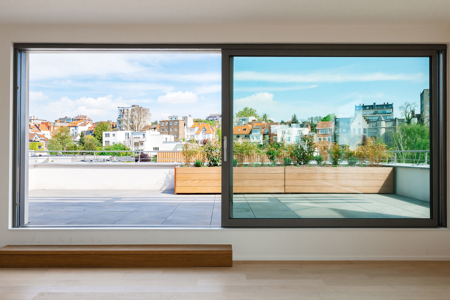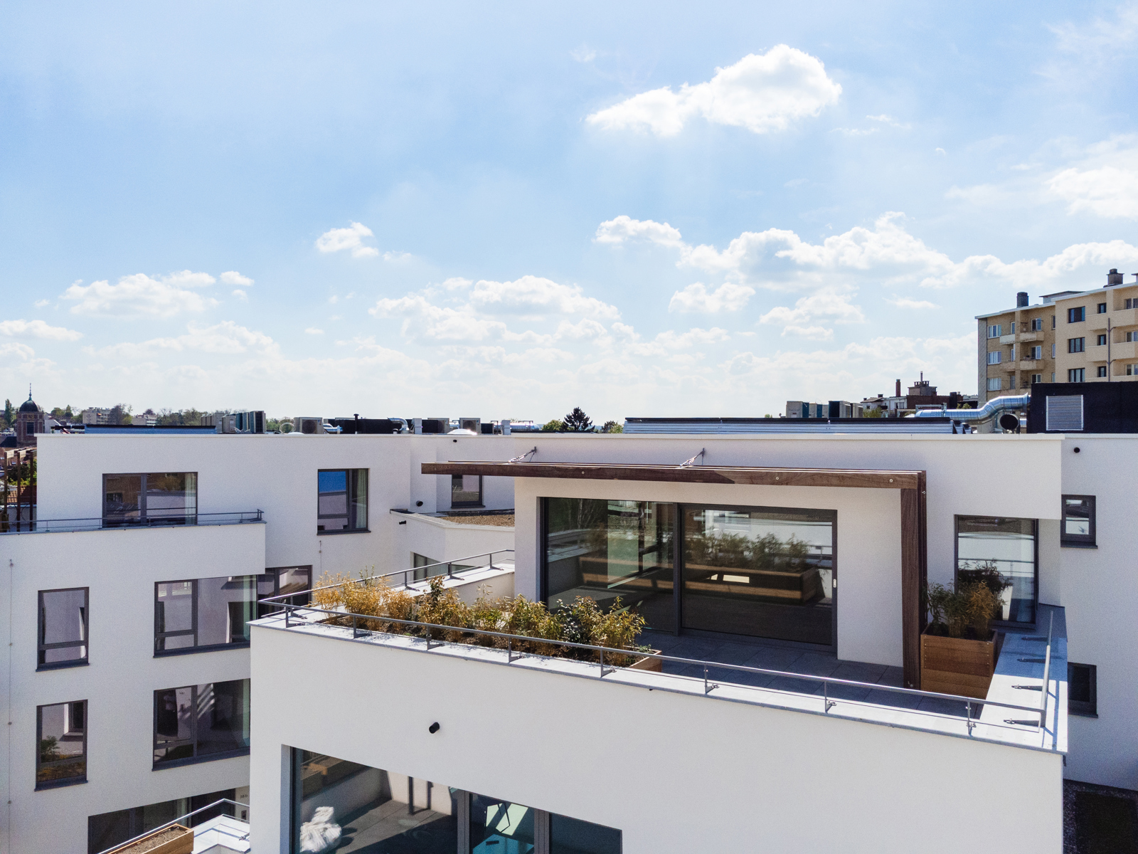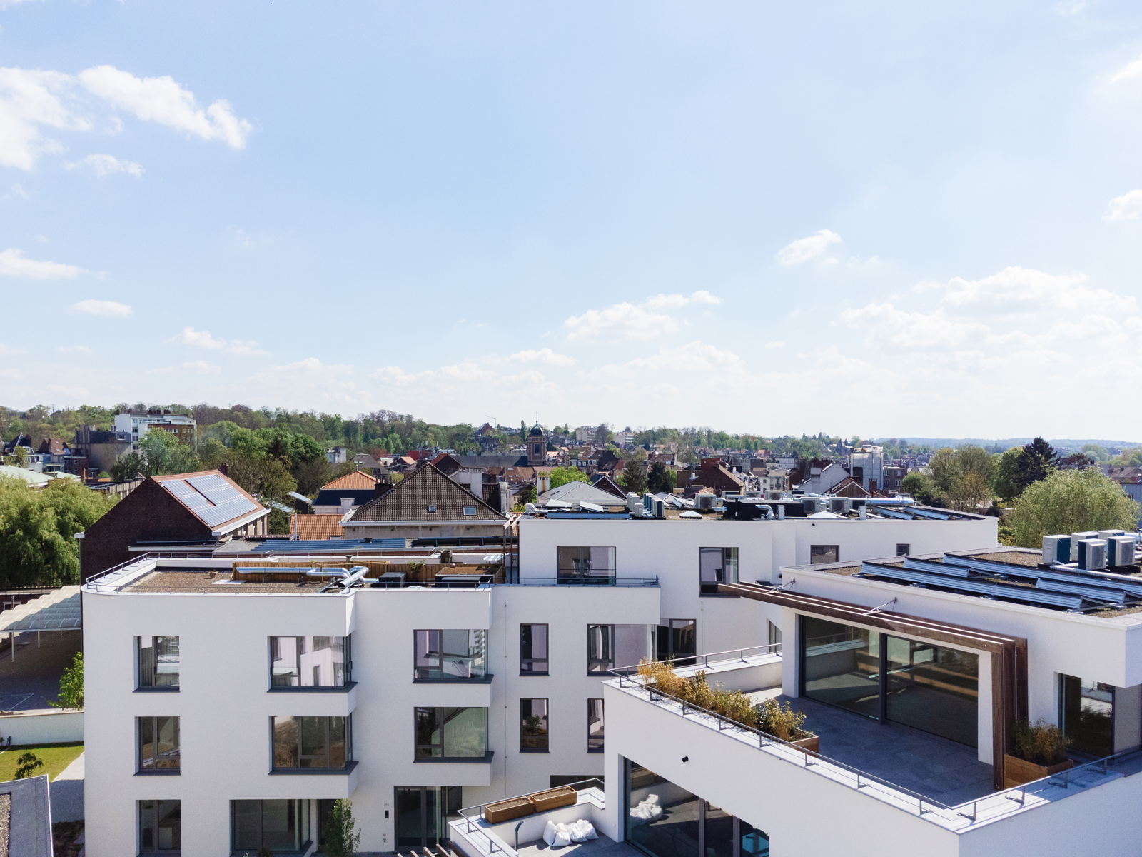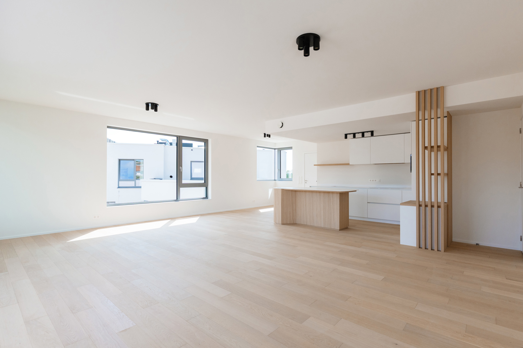VICTOIRE Junot is pleased to present this splendid penthouse, spacious, bright, and uniquely designed, pleasantly overlooking the Carré Coghen development. Ideally located in the heart of Uccle, in a quiet yet urban environment, this property benefits from a beautiful inner garden and is within immediate reach of a wide range of urban amenities. The apartment is laid out as follows: A beautiful entrance hall, with space for a cloakroom and guest toilet, opens onto a large living area featuring a fully equipped open-plan kitchen, a dining area, and a living room. A lovely terrace, extended by a green roof, beautifully enhances this living space. The night area includes two bedrooms, one of which has an en-suite bathroom (with bathtub, washbasin, and toilet), as well as a second shower room with a walk-in shower and a washbasin. Bikestorage + basement included. 2 compulsory parking spaces at extra cost ( + 2 x €40,000 ) Sale subject to 21% VAT – Possibility of reduced 6% VAT, subject to conditions.