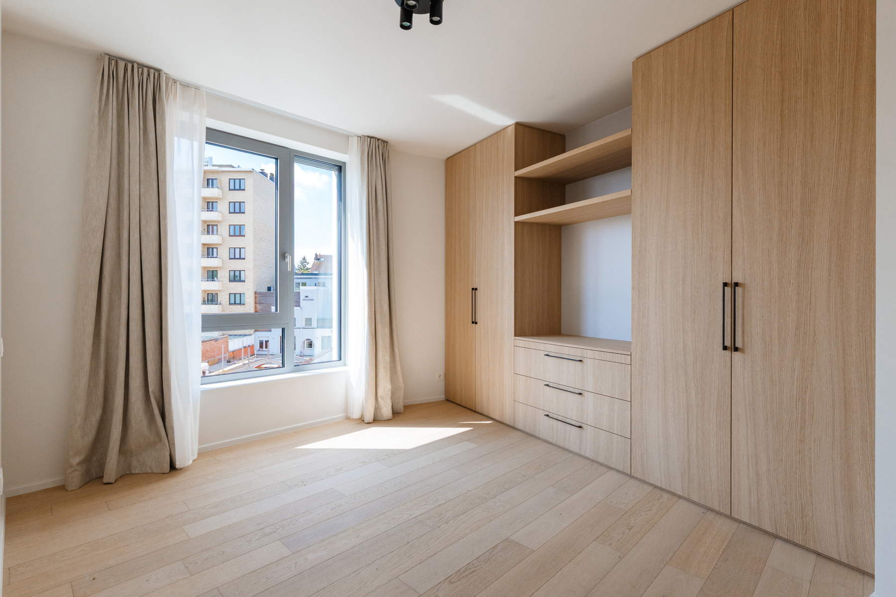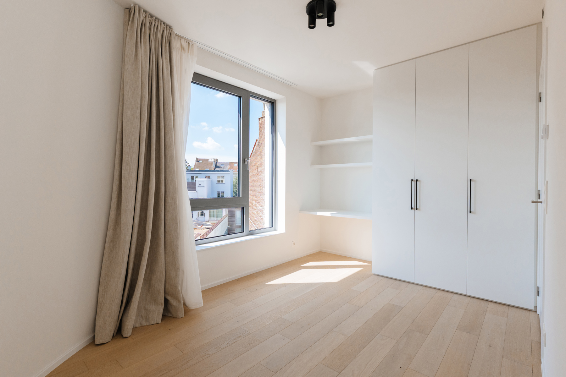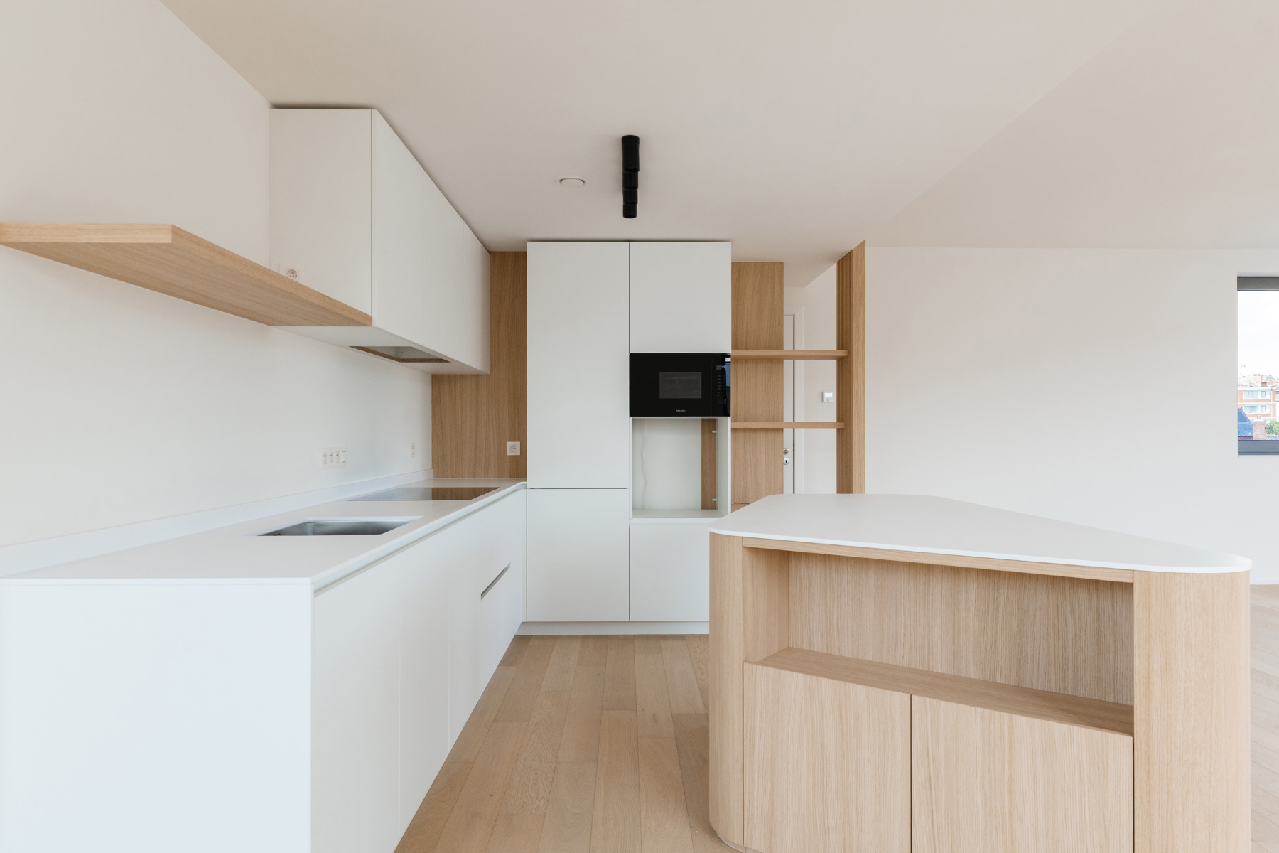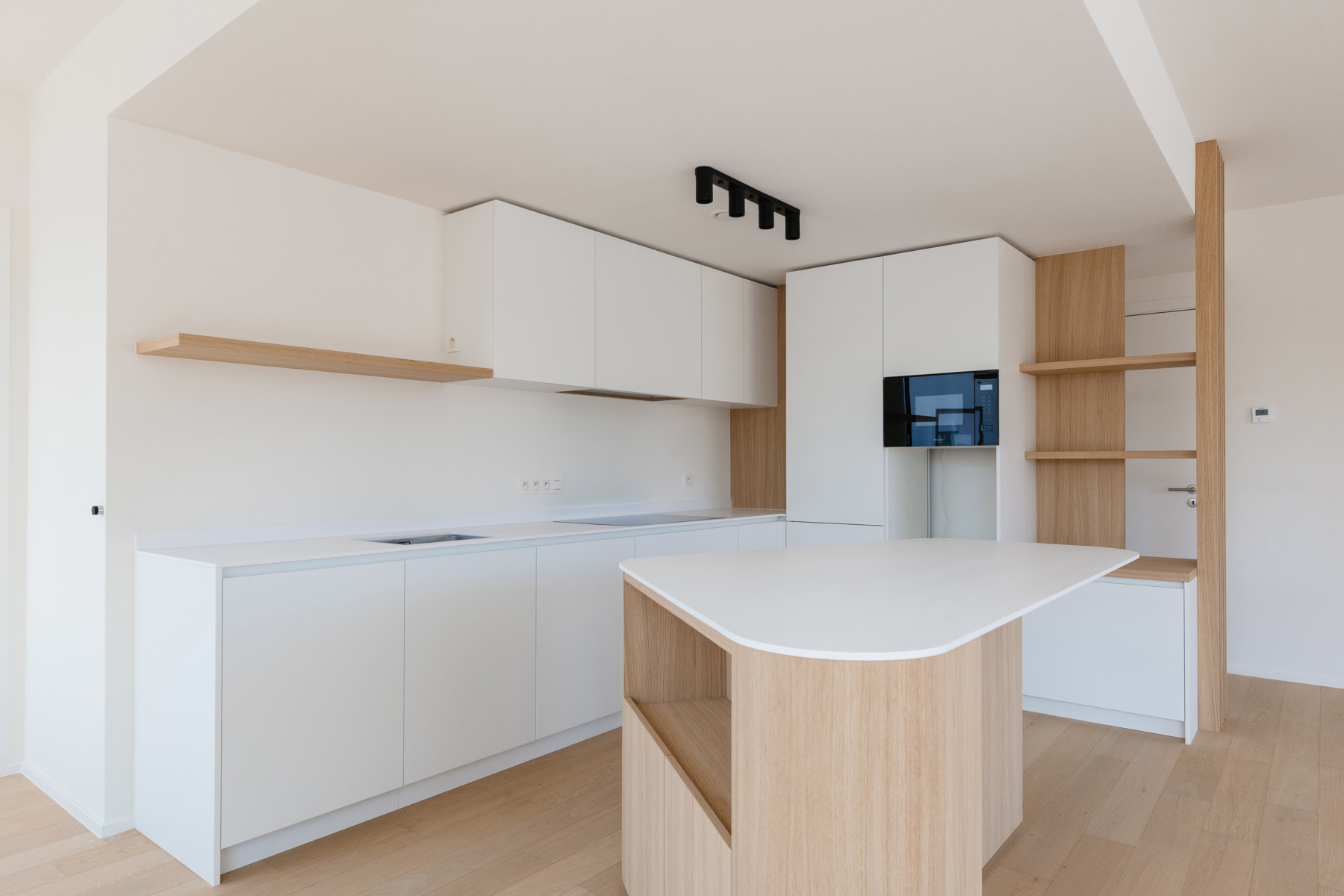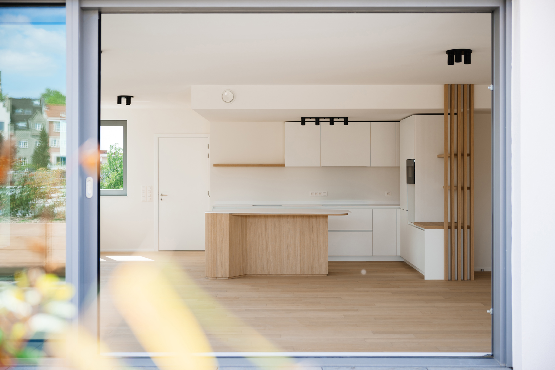 VICTOIRE Junot is pleased to present this splendid penthouse, spacious, bright, and uniquely designed, pleasantly overlooking the Carré Coghen development. Ideally located in the heart of Uccle, in a quiet yet urban environment, this property benefits from a beautiful inner garden and is within immediate reach of a wide range of urban amenities. The apartment is laid out as follows: A beautiful entrance hall, with space for a cloakroom and guest toilet, opens onto a large living area featuring a fully equipped open-plan kitchen, a dining area, and a living room. A lovely terrace, extended by a green roof, beautifully enhances this living space. The night area includes two bedrooms, one of which has an en-suite bathroom (with bathtub, washbasin, and toilet), as well as a second shower room with a walk-in shower and a washbasin. Bikestorage + basement included. 2 compulsory parking spaces at extra cost ( + 2 x €40,000 ) Sale subject to 21% VAT – Possibility of reduced 6% VAT, subject to conditions.