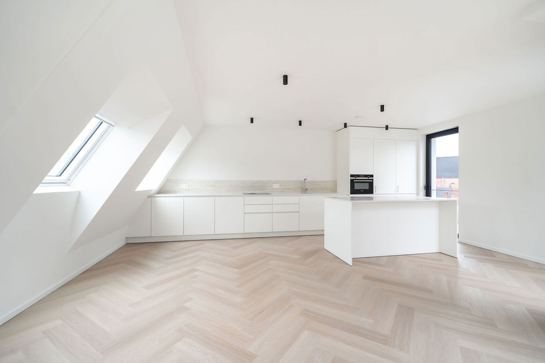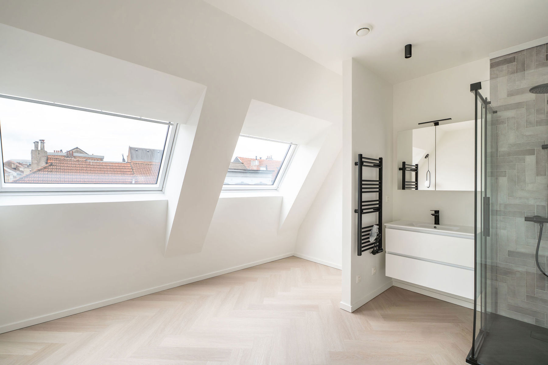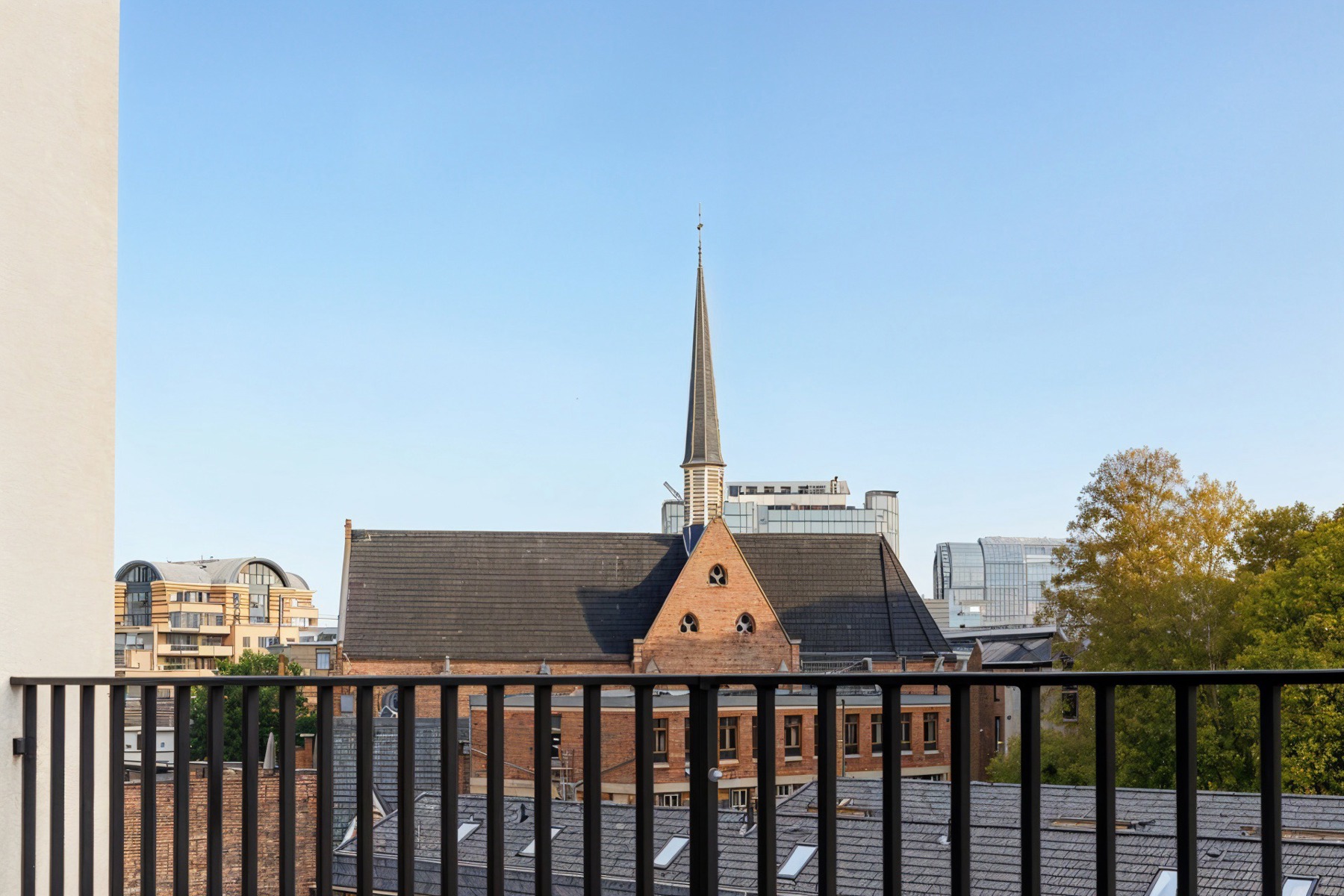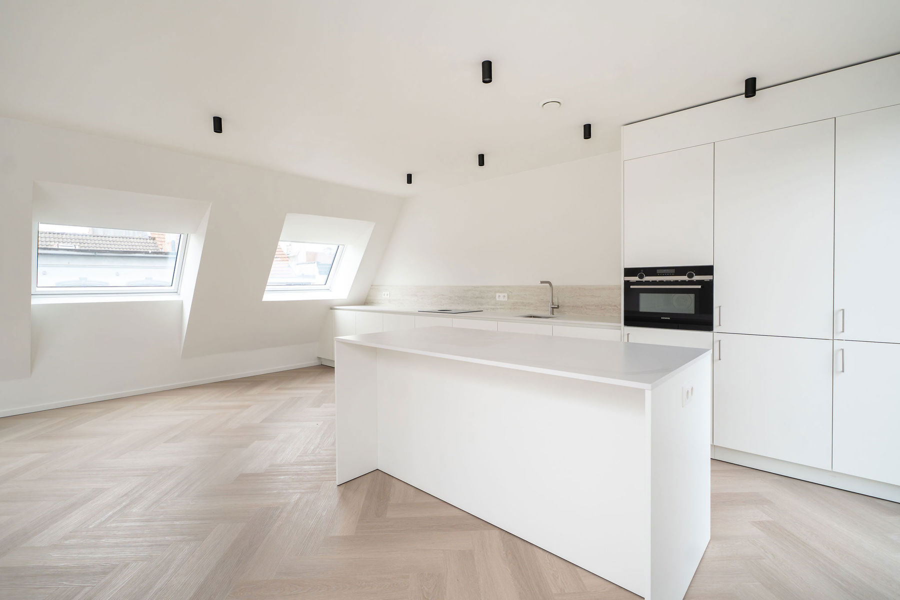 In the “EUROCROWN” project - a fantastic metamorphosis of a beautiful old building, Victoire-JUNOT proposes this beautiful penthouse with a surface area of ± 107 sq.m. + 7 sq.m. terrace. Located on the top floor, the apartment is composed as follows: Entrance hall with guest toilet, spacious bright reception room giving access to the terrace with a beautiful unobstructed view, fully-equipped open kitchen, 2 bedrooms, each with its own shower room, laundry/utility room. The complex is a highly successful blend of contemporary architecture and the latest construction techniques, in compliance with 2025 energy standards. Your daily comfort will be assured by underfloor heating, heat pumps powered by photovoltaic panels, and ultra-efficient “ENERGY” windows. The kitchen and bathroom fittings have been carefully selected in an elegant, “urban chic” style. The building has no parking facilities, but each apartment has a cellar and one or two bicycle parking spaces. You'll enjoy an ideal location, between Luxembourg Square and the lively Place Flagey district. Sale subject to VAT (21%) as this is a new additional floor.