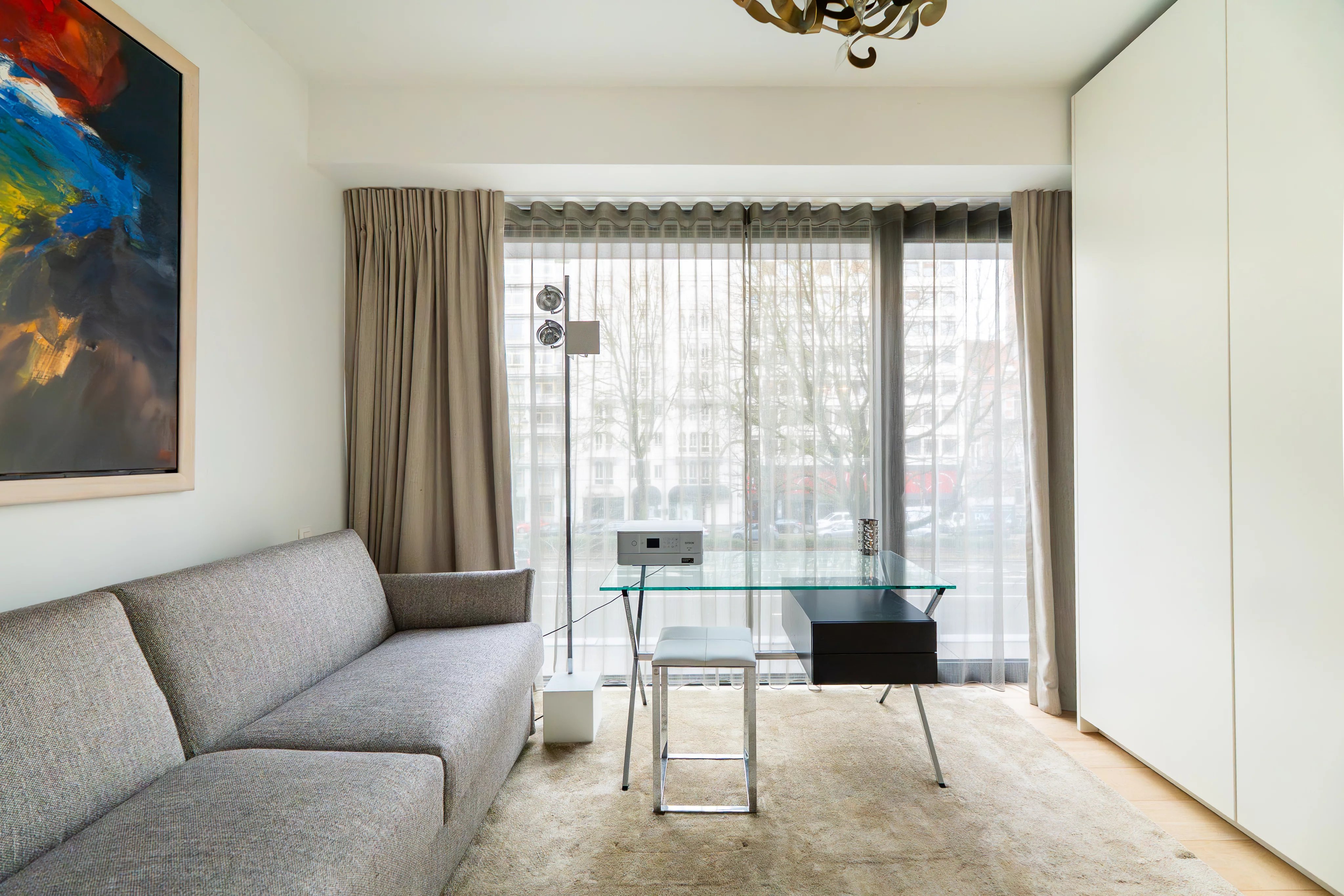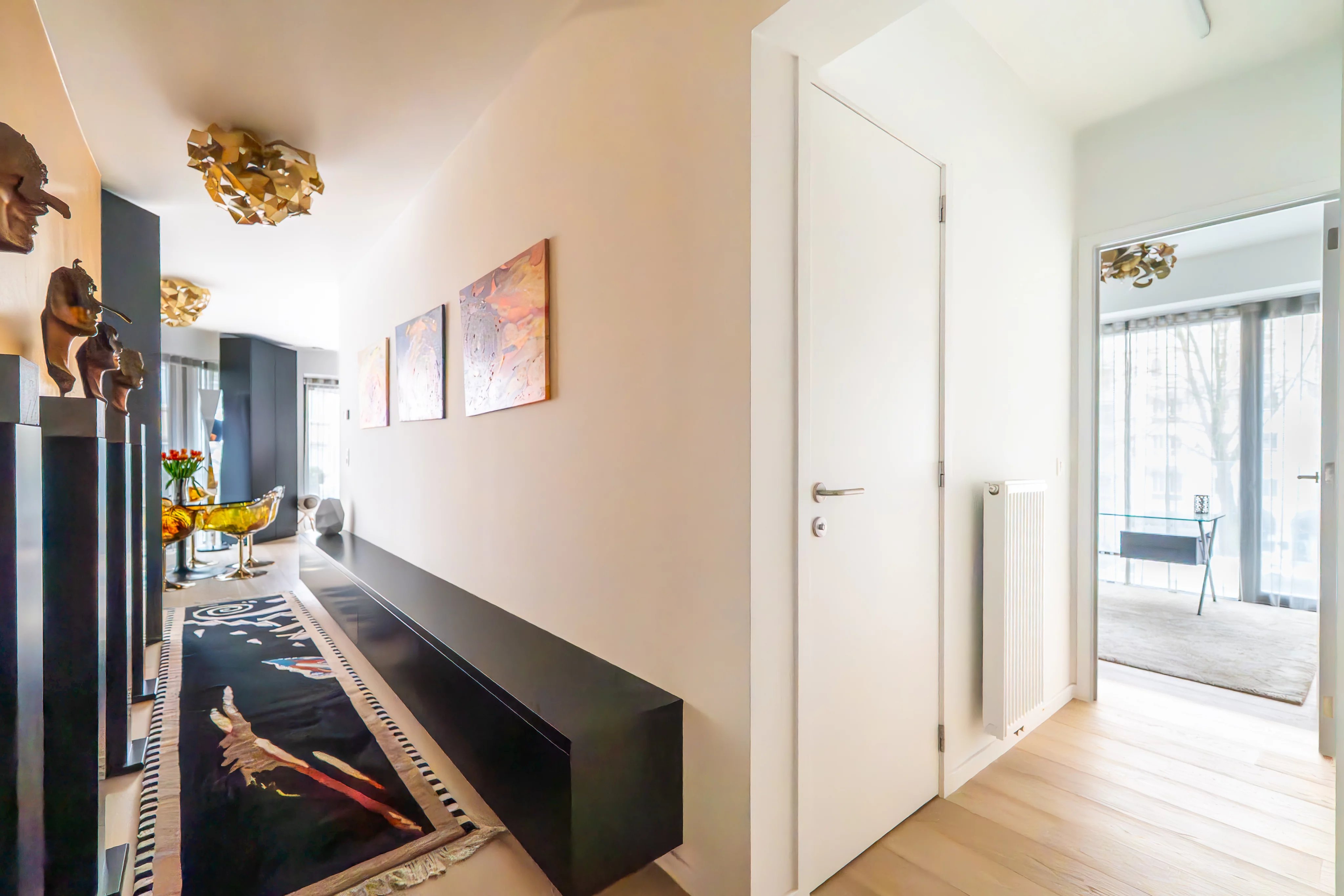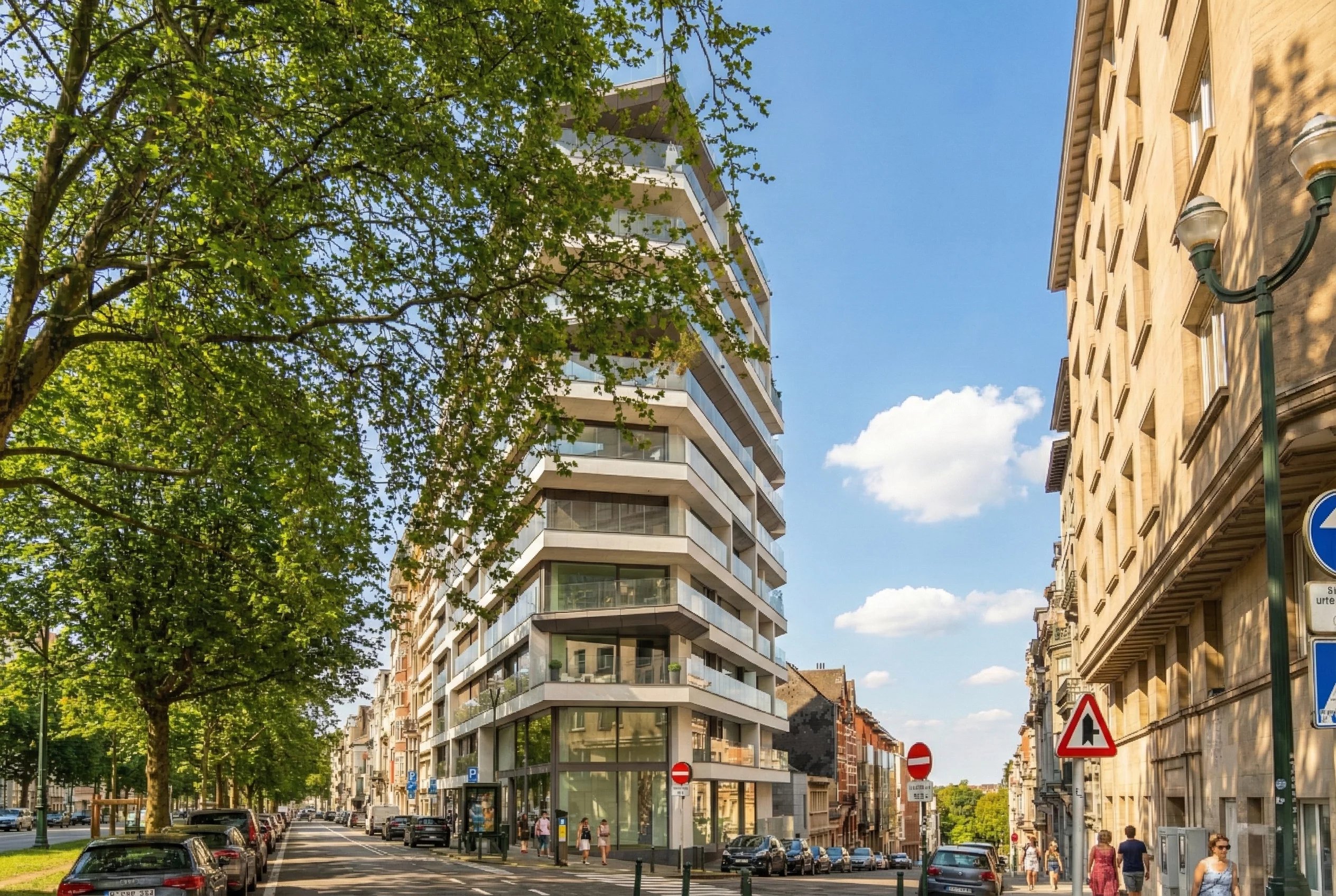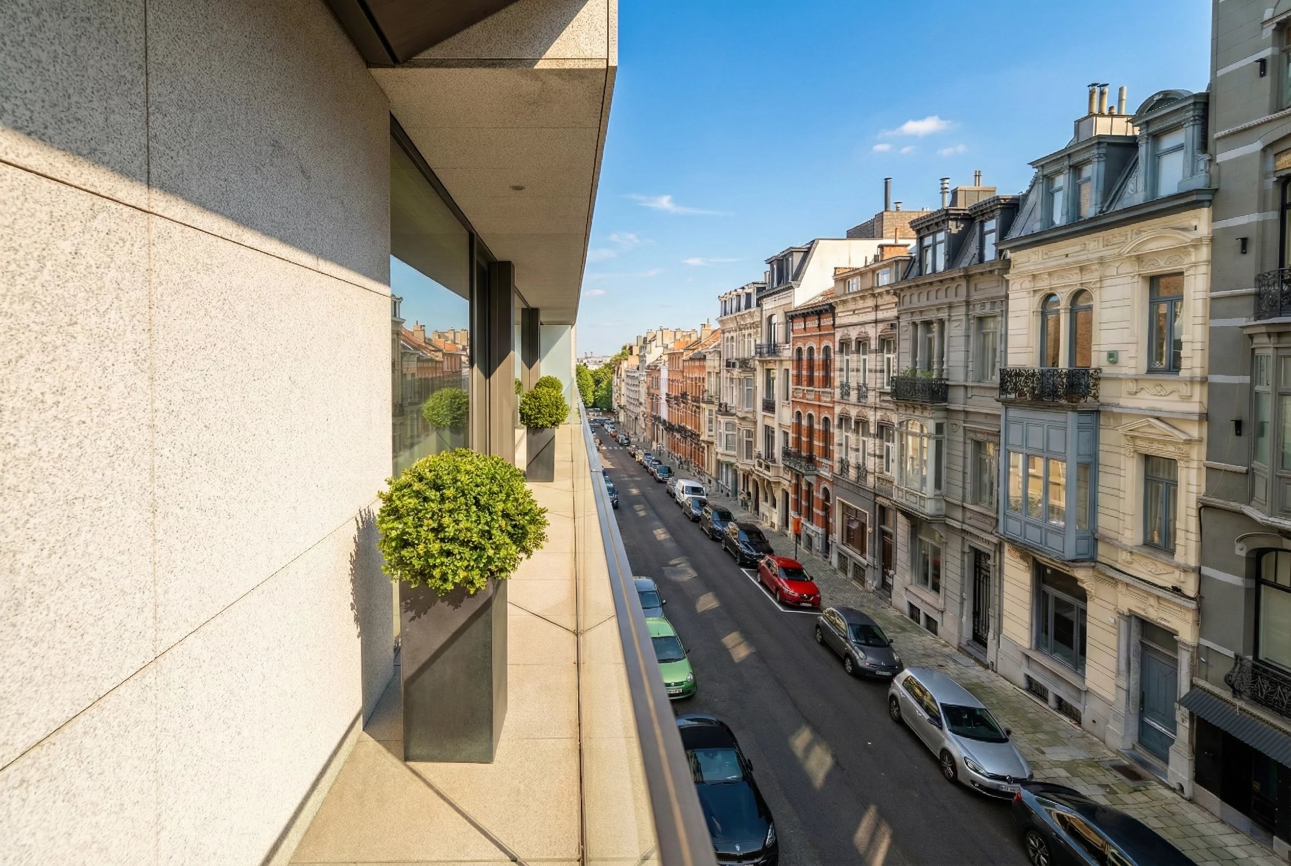Located on the prestigious Avenue Louise, in immediate proximity to the Bois de la Cambre, this elegant apartment is situated on the second floor of a contemporary building. It offers a living area of approximately 110 sqm (EPC C+) and benefits from a pleasant terrace of about 30 sqm. Designed by architect Marc Corbiau, it stands out for the coherence of its architectural concept, the quality of its finishes and its distinctly contemporary comfort. The apartment opens onto a welcoming entrance hall that harmoniously distributes the reception areas. Bathed in natural light, the living room and dining area are arranged around a fully equipped open-plan kitchen with a sleek and functional design, perfectly integrated into the living space. The night area consists of two well-proportioned bedrooms. The apartment also features a bathroom, a shower room and a separate laundry room. Numerous built-in storage units complete the property and ensure a discreet and efficient organisation of the spaces. From a technical standpoint, the property is equipped with a double-flow ventilation system and includes a private cellar in the basement. An indoor parking space allowing two cars to be parked in tandem is available as an option for €90,000.