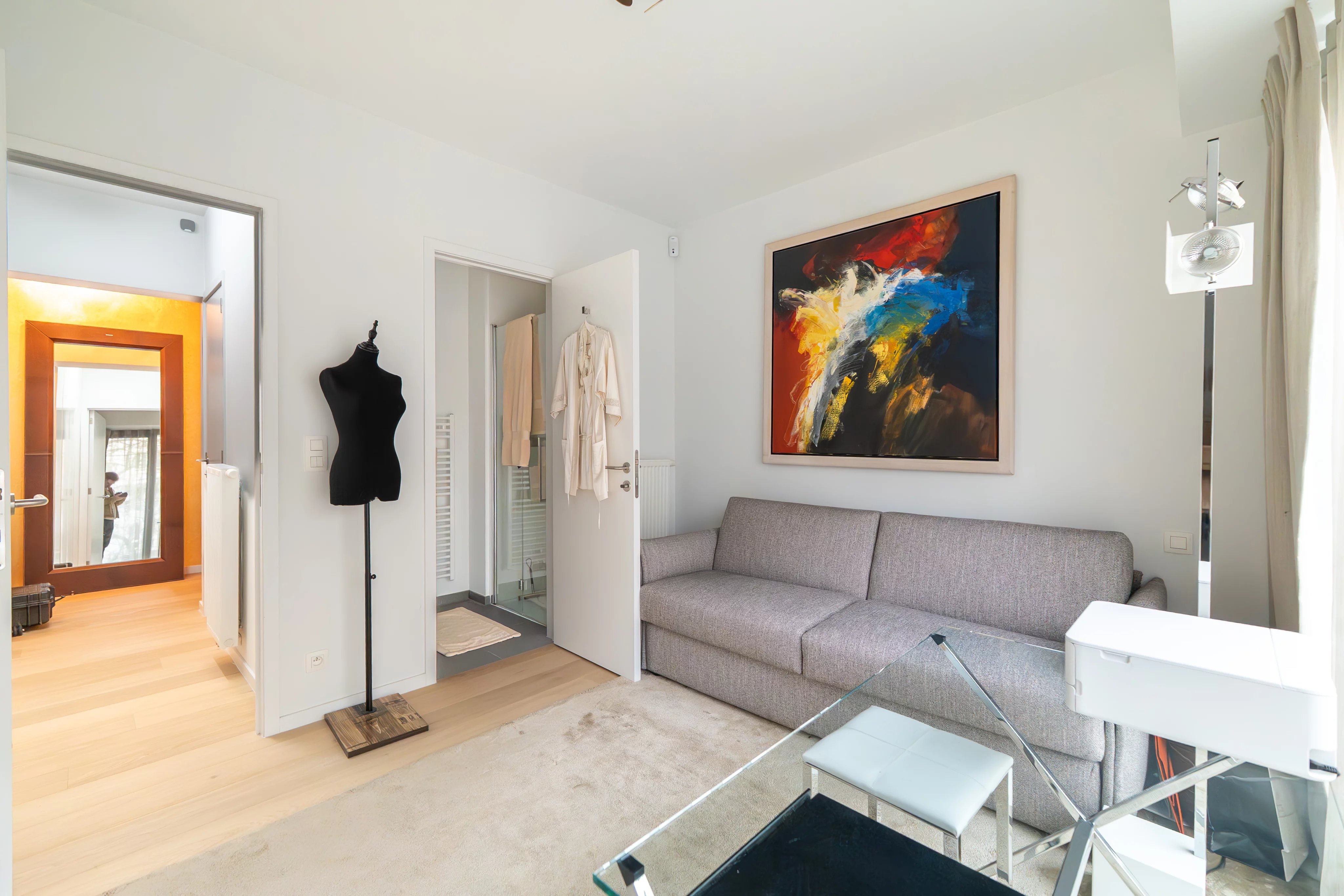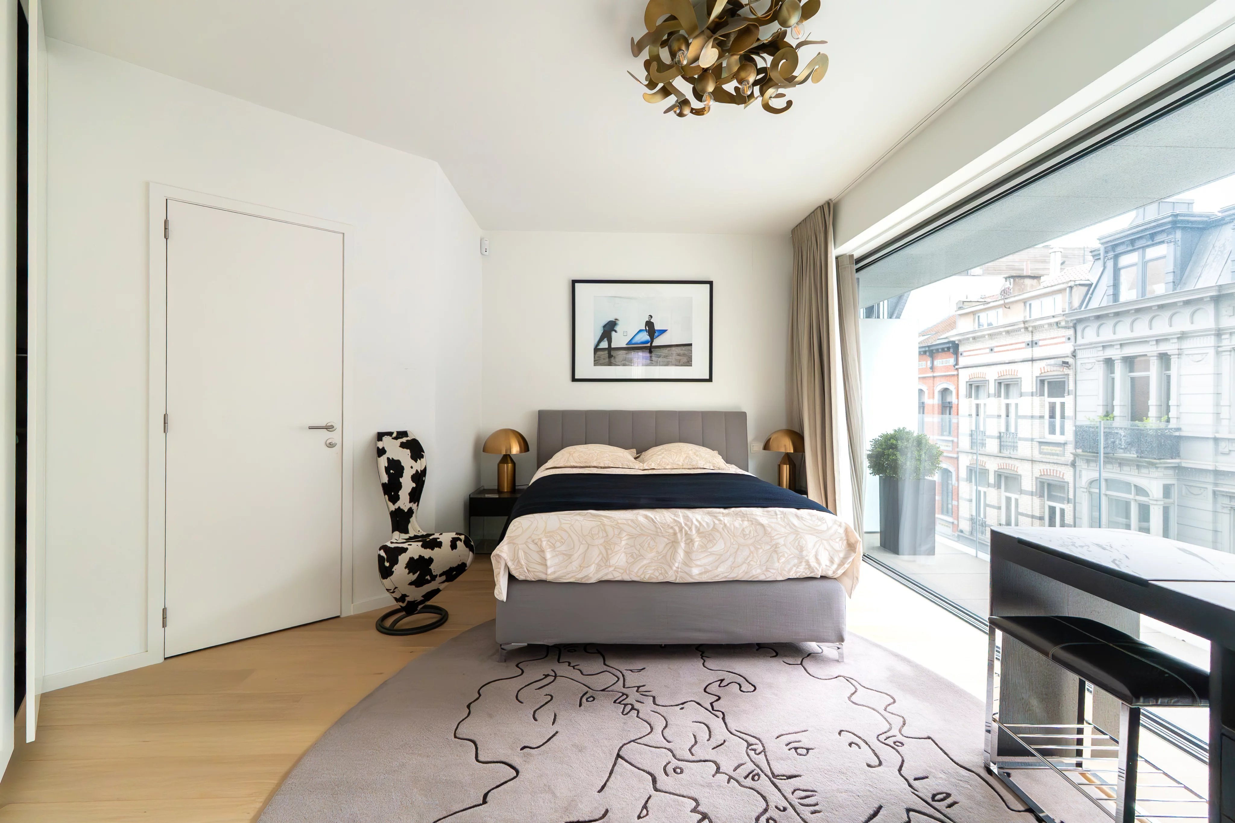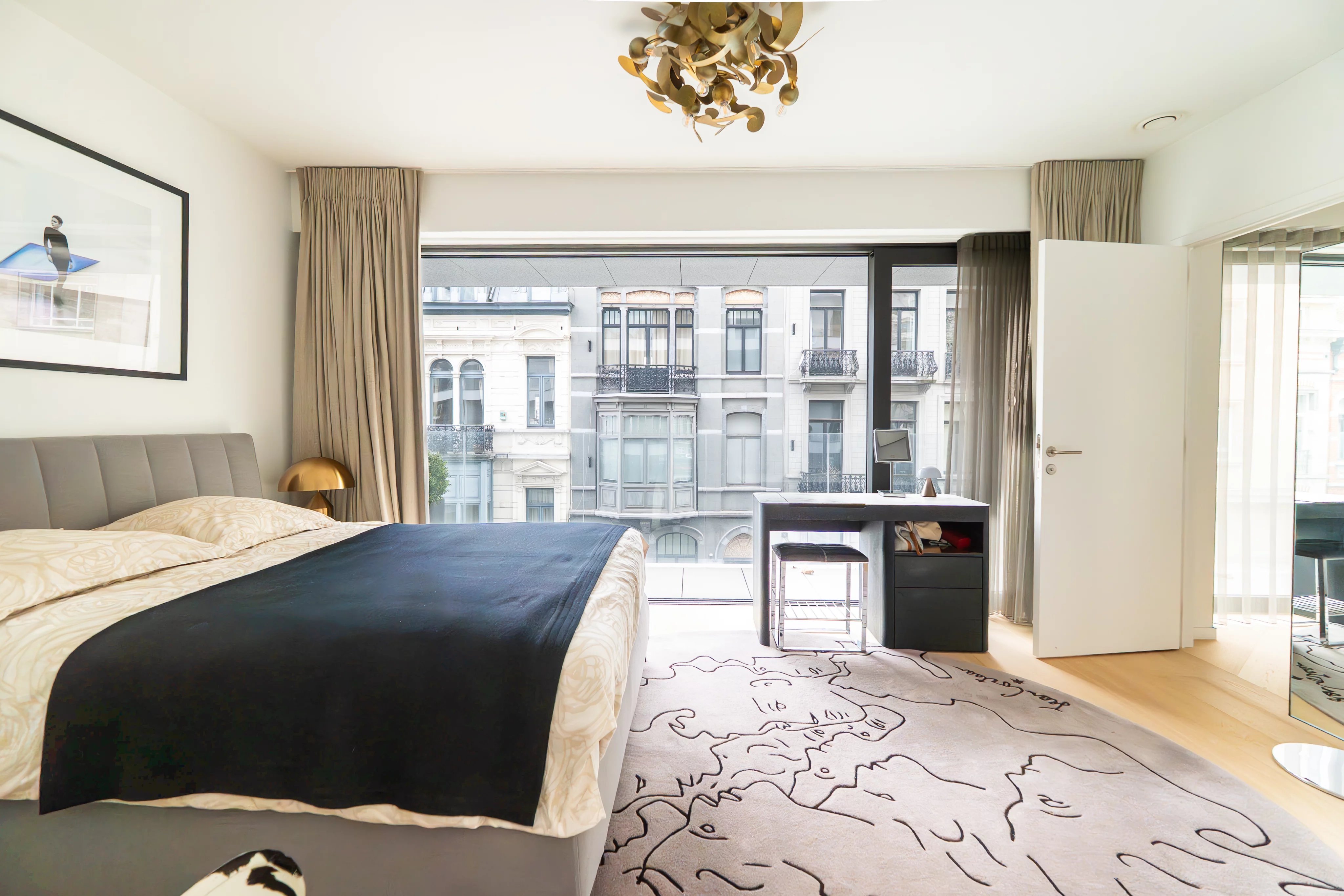 Located on the prestigious Avenue Louise, in immediate proximity to the Bois de la Cambre, this elegant apartment is situated on the second floor of a contemporary building. It offers a living area of approximately 110 sqm (EPC C+) and benefits from a pleasant terrace of about 30 sqm. Designed by architect Marc Corbiau, it stands out for the coherence of its architectural concept, the quality of its finishes and its distinctly contemporary comfort. The apartment opens onto a welcoming entrance hall that harmoniously distributes the reception areas. Bathed in natural light, the living room and dining area are arranged around a fully equipped open-plan kitchen with a sleek and functional design, perfectly integrated into the living space. The night area consists of two well-proportioned bedrooms. The apartment also features a bathroom, a shower room and a separate laundry room. Numerous built-in storage units complete the property and ensure a discreet and efficient organisation of the spaces. From a technical standpoint, the property is equipped with a double-flow ventilation system and includes a private cellar in the basement. An indoor parking space allowing two cars to be parked in tandem is available as an option for €90,000.
