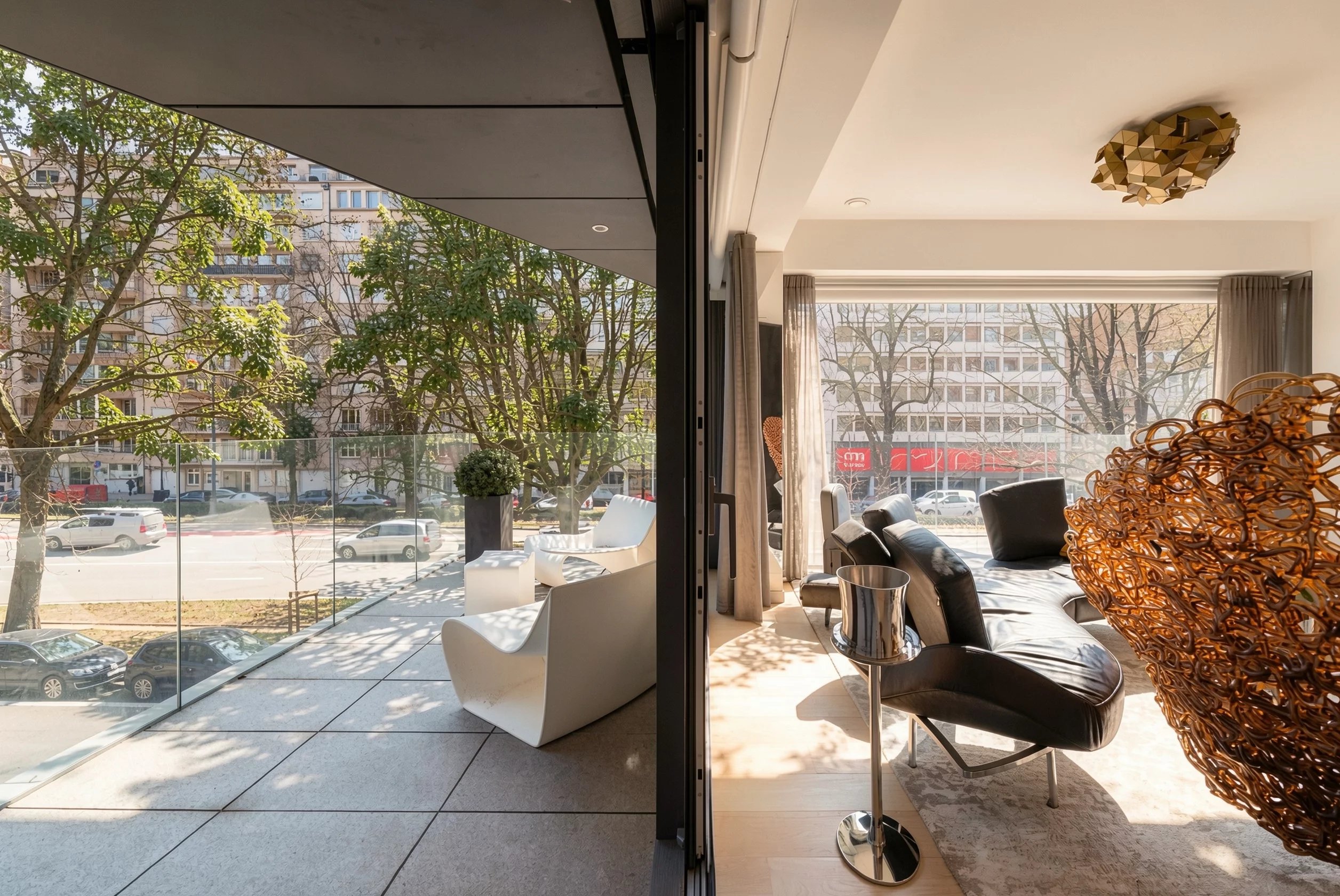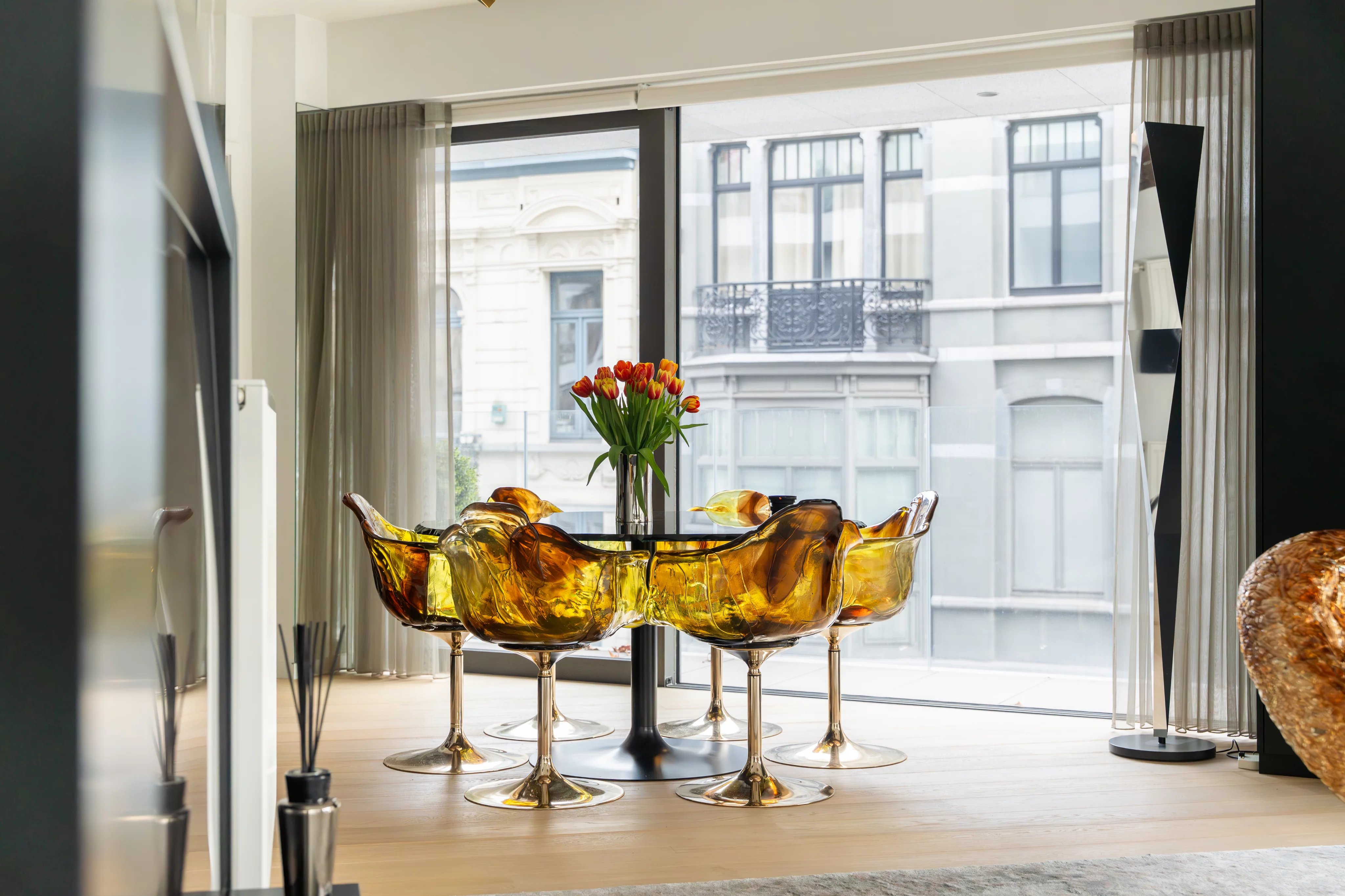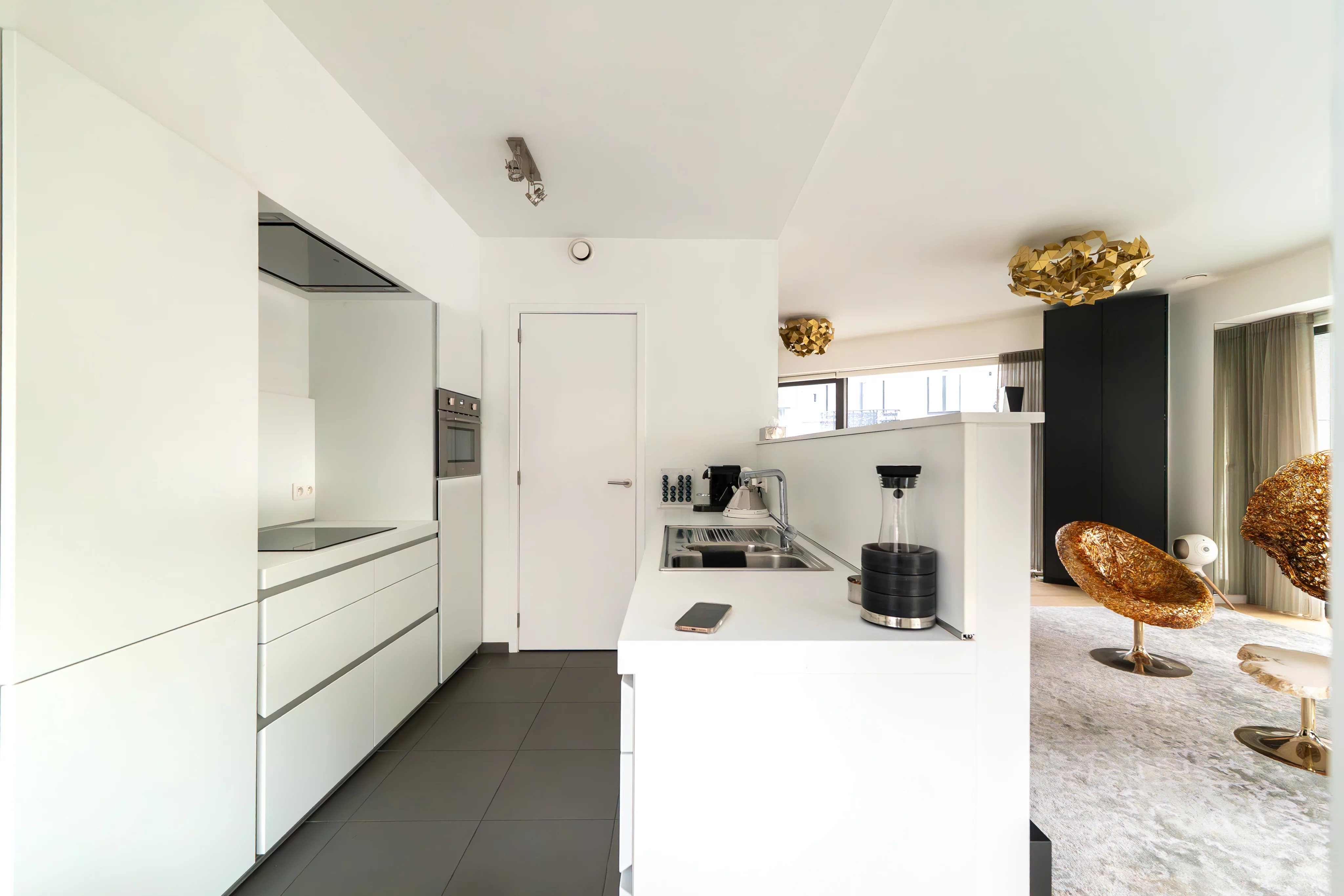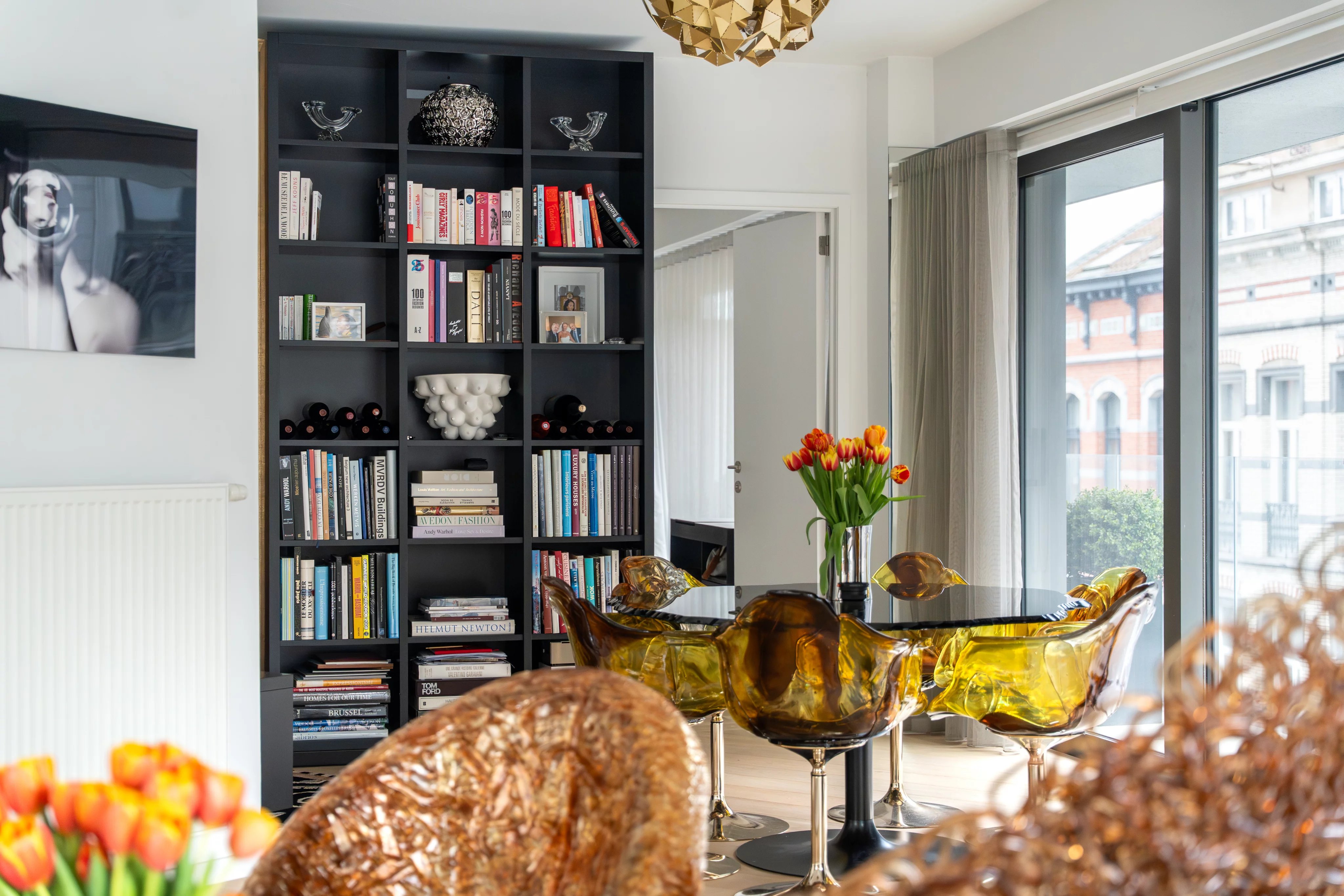 Located on the prestigious Avenue Louise, in immediate proximity to the Bois de la Cambre, this elegant apartment is situated on the second floor of a contemporary building. It offers a living area of approximately 110 sqm (EPC C+) and benefits from a pleasant terrace of about 30 sqm. Designed by architect Marc Corbiau, it stands out for the coherence of its architectural concept, the quality of its finishes and its distinctly contemporary comfort. The apartment opens onto a welcoming entrance hall that harmoniously distributes the reception areas. Bathed in natural light, the living room and dining area are arranged around a fully equipped open-plan kitchen with a sleek and functional design, perfectly integrated into the living space. The night area consists of two well-proportioned bedrooms. The apartment also features a bathroom, a shower room and a separate laundry room. Numerous built-in storage units complete the property and ensure a discreet and efficient organisation of the spaces. From a technical standpoint, the property is equipped with a double-flow ventilation system and includes a private cellar in the basement. An indoor parking space allowing two cars to be parked in tandem is available as an option for €90,000.