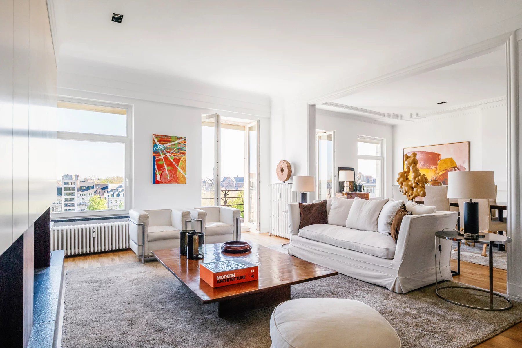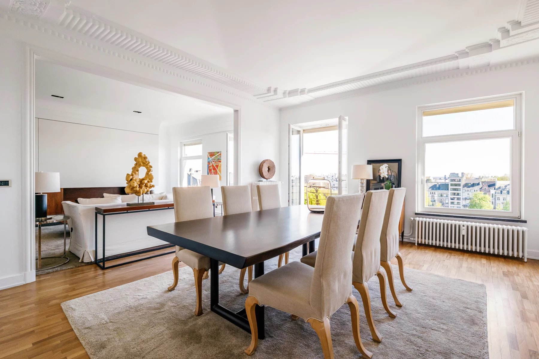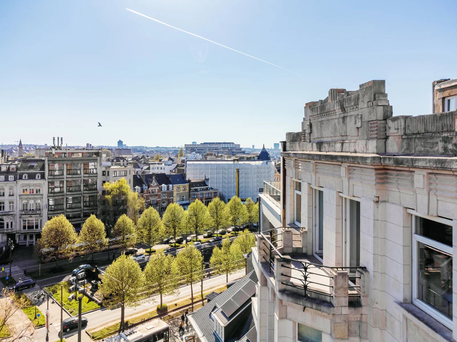 Lumineux penthouse de +/- 134 m² et +/- 40 m² terrasse - Hall d'entrée, porte blindée, - Grandes réceptions de +/- 65 m² avec parquet, meubles intégrés, feu ouvert, balcon avec vue sur le square Montgomery et la fontaine, - Cuisine super équipée - Grande chambre arrière, - Salle de bains en marbre - Dressing séparé (2ème chambre à l'origine avec cuisine), permettant l'accès à la Terrasse de +/- 40 m². - Chambre de bonne au 7ème étage (accès par escalier), pouvant être reliée à l'appartement afin d'aménager une chambre supplémentaire - cave - Box parking n°3 au sous-sol Divers -Nouvelle chaudière double à condensation de marque Viessmann 2026 -Isolation de la tuyauterie de chauffage dans les caves et garages -Rénovation de la porte d’entrée extérieure , incluant les faces intérieure et extérieure, le chambranle et la fenêtre haute frais pris en charge par le - propriétaire. - porte blindée Fichet - - système d'alarme - - électricité conforme - - plafonds moulurés - - screens extérieurs automatiques - - F-O à l'huile Copropriété - 8 copropriétaires - ascenseur conforme - toiture isolée - façades avant et arrière refaites - charges : +/- 333 euros/mois pour les charges communes et le chauffage - Installation d’une nouvelle chaudière double à condensation de marque Viessmann. -L’isolation de la tuyauterie de chauffage dans les caves et garages -le fond de réserve : 216,- euros/mois - Document remis à titre informatif et non-contractuel
