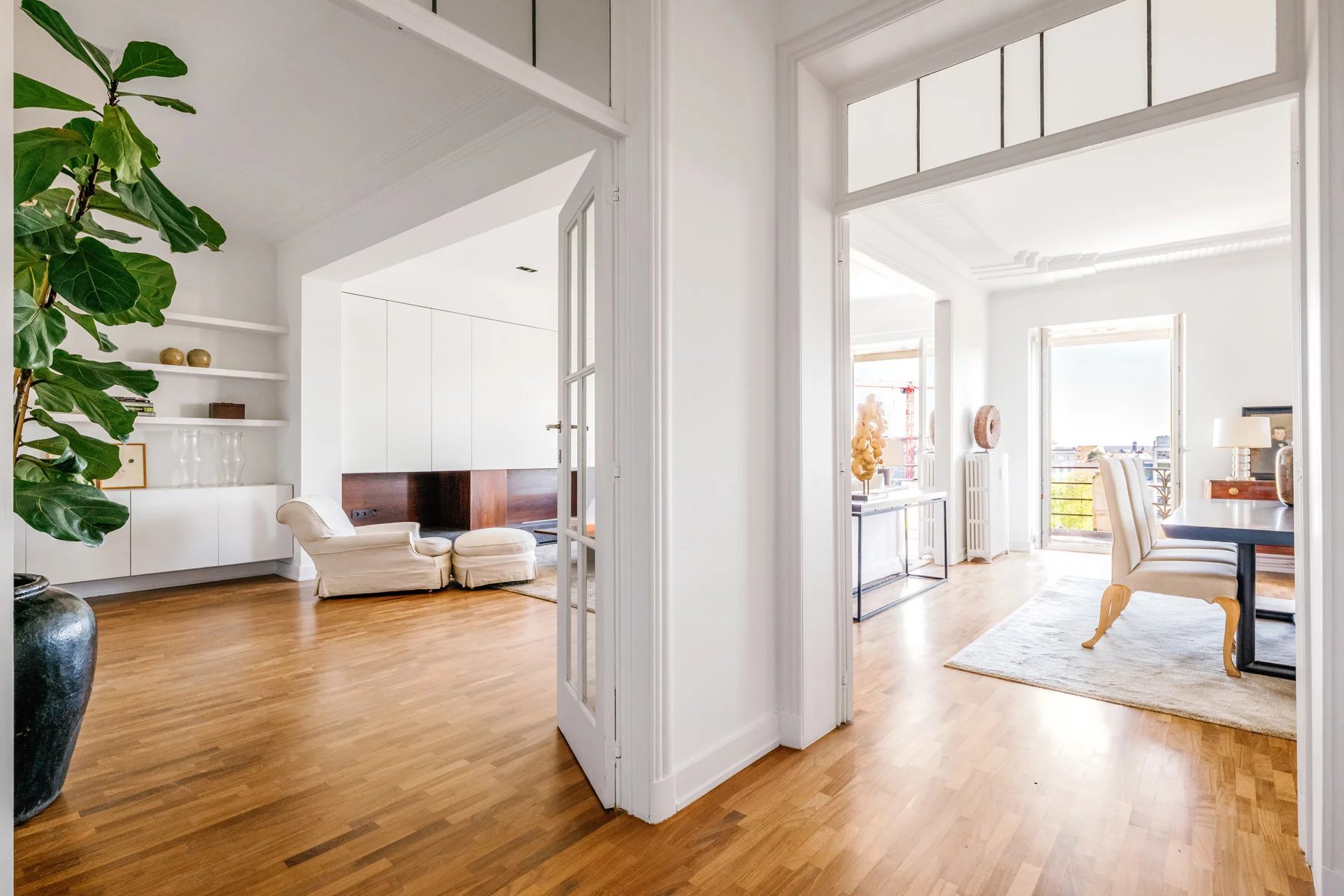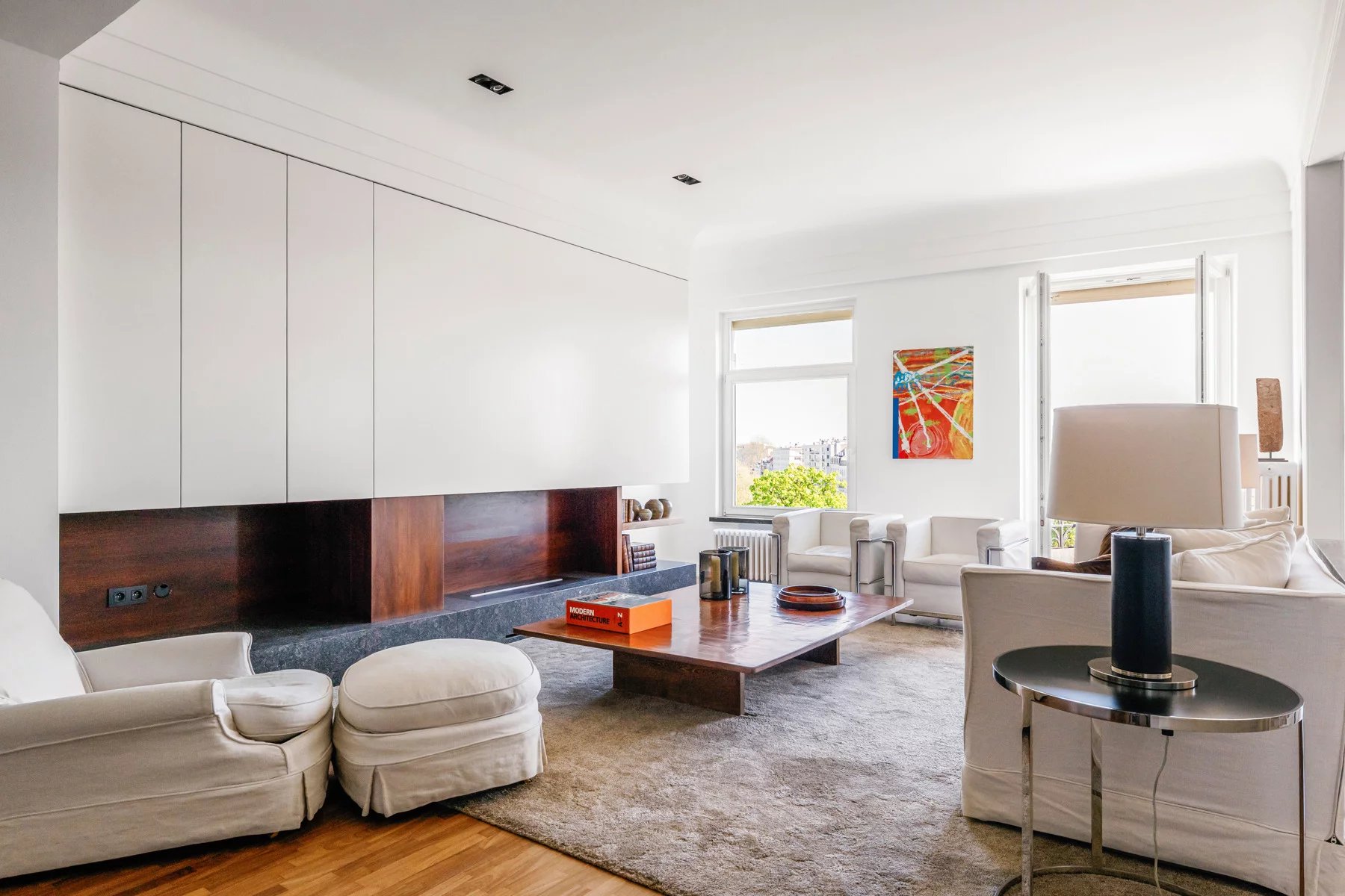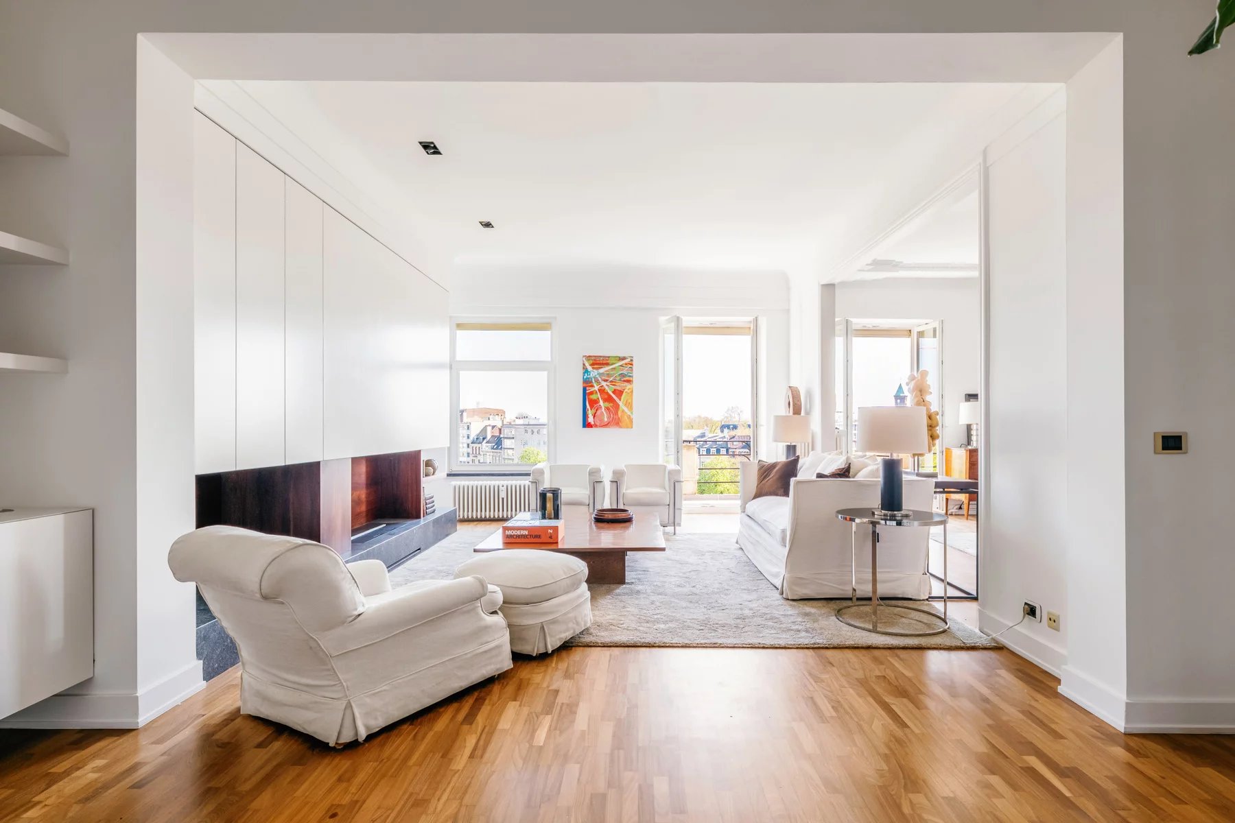 Lumineux penthouse de +/- 134 m² et +/- 40 m² terrasse - Hall d'entrée, porte blindée, - Grandes réceptions de +/- 65 m² avec parquet, meubles intégrés, feu ouvert, balcon avec vue sur le square Montgomery et la fontaine, - Cuisine super équipée - Grande chambre arrière, - Salle de bains en marbre - Dressing séparé (2ème chambre à l'origine avec cuisine), permettant l'accès à la Terrasse de +/- 40 m². - Chambre de bonne au 7ème étage (accès par escalier), pouvant être reliée à l'appartement afin d'aménager une chambre supplémentaire - cave - Box parking n°3 au sous-sol Divers -Nouvelle chaudière double à condensation de marque Viessmann 2026 -Isolation de la tuyauterie de chauffage dans les caves et garages -Rénovation de la porte d’entrée extérieure , incluant les faces intérieure et extérieure, le chambranle et la fenêtre haute frais pris en charge par le - propriétaire. - porte blindée Fichet - - système d'alarme - - électricité conforme - - plafonds moulurés - - screens extérieurs automatiques - - F-O à l'huile Copropriété - 8 copropriétaires - ascenseur conforme - toiture isolée - façades avant et arrière refaites - charges : +/- 333 euros/mois pour les charges communes et le chauffage - Installation d’une nouvelle chaudière double à condensation de marque Viessmann. -L’isolation de la tuyauterie de chauffage dans les caves et garages -le fond de réserve : 216,- euros/mois - Document remis à titre informatif et non-contractuel