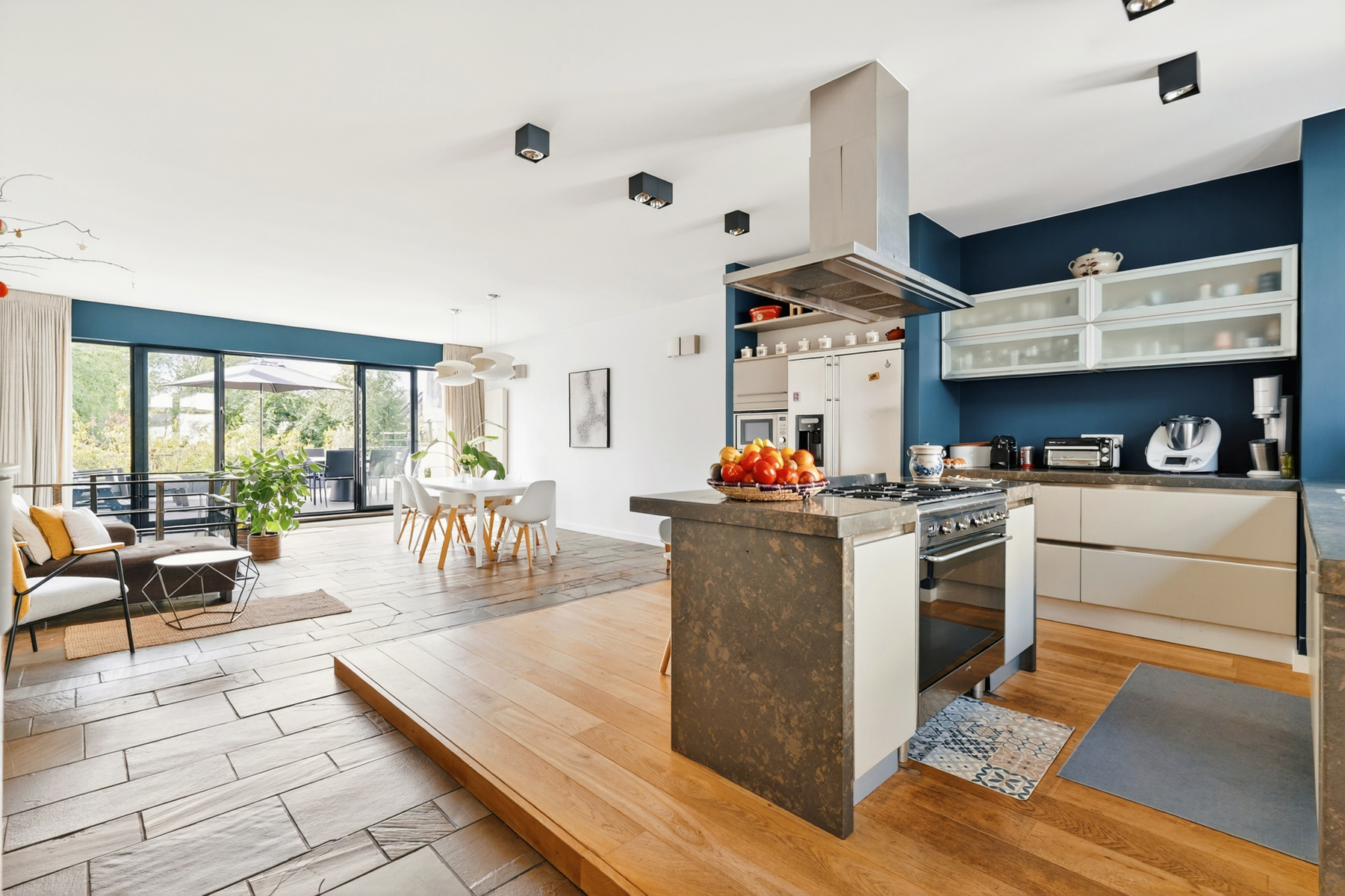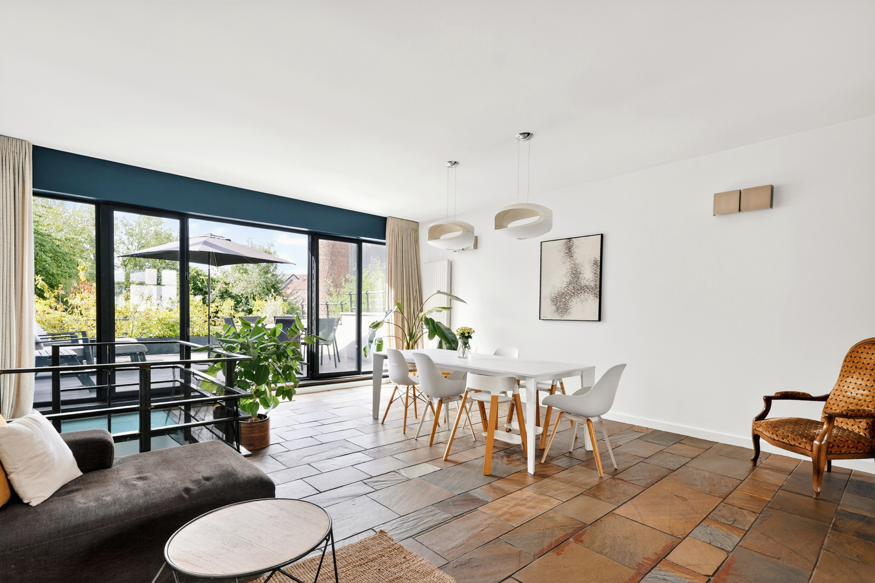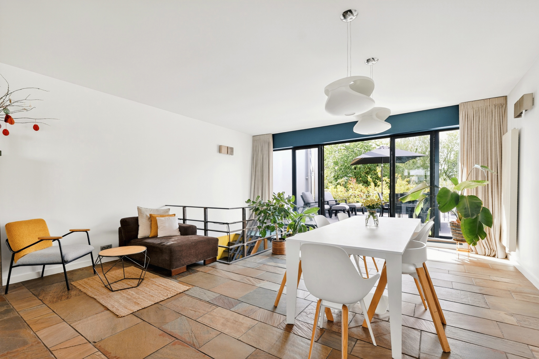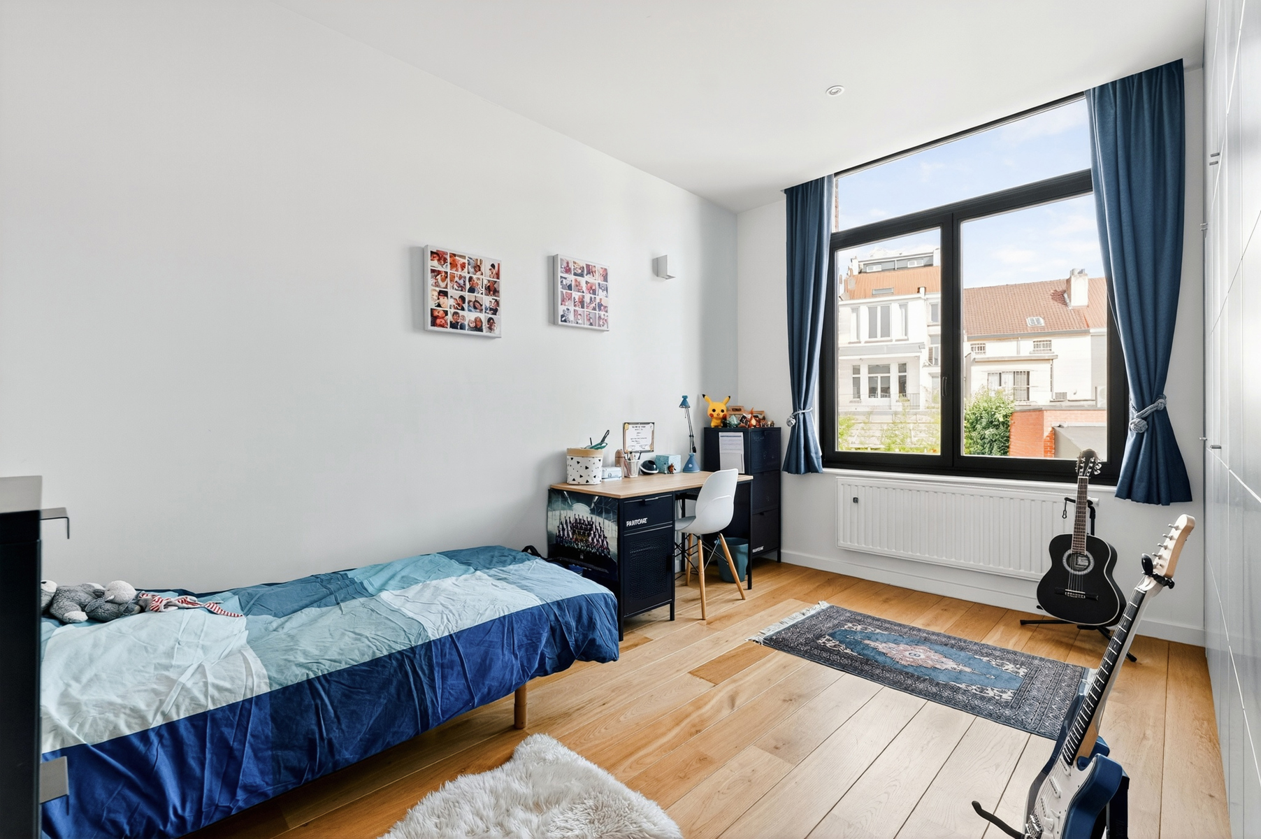 Victoire - Junot exclusively presents this charming 1920s house, fully renovated in a loft spirit, combining impressive volumes, abundant natural light, and absolute discretion. Behind a delightful carriage gate lies a true haven of peace: A spacious entrance hall with cloakroom welcomes you, followed by an office, a guest bedroom with adjoining shower room, a warm family room with optional sauna, and two inviting living rooms with open fireplace, bathed in sunlight from skylights, plus a guest toilet – all opening onto a terrace and a south-facing garden. On the first floor, you will find a superb open-plan kitchen with wood-burning stove, a bright dining room, and two terraces perfect for summer evenings. The second floor offers three beautiful bedrooms and a modern shower room. Finally, the top level is entirely dedicated to the master suite, with ample bespoke storage, a mezzanine bathroom, and a unique cocooning atmosphere. The property is completed by spacious cellars (wine cellar, laundry, storage) and two garage boxes (in option) located in the immediate vicinity. A rare property, hidden from view, designed for lovers of originality and discretion. EPC: E | Electricity compliant | Electric shutters. A house to discover – “To live happily, live hidden.” Located in the heart of Uccle, just steps away from the shops of Parvis St. Pierre, public transport, schools, and Wolvendael Park.