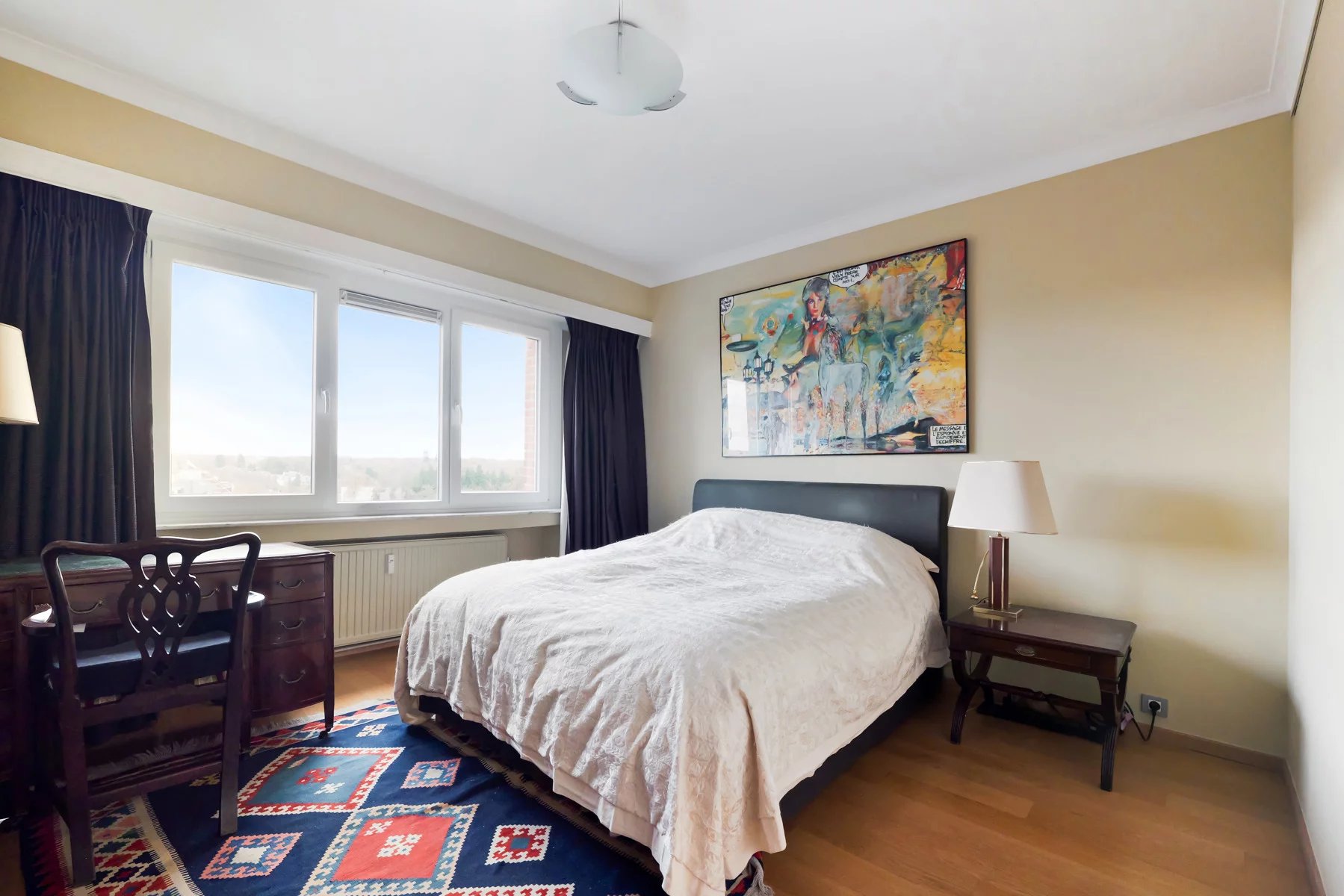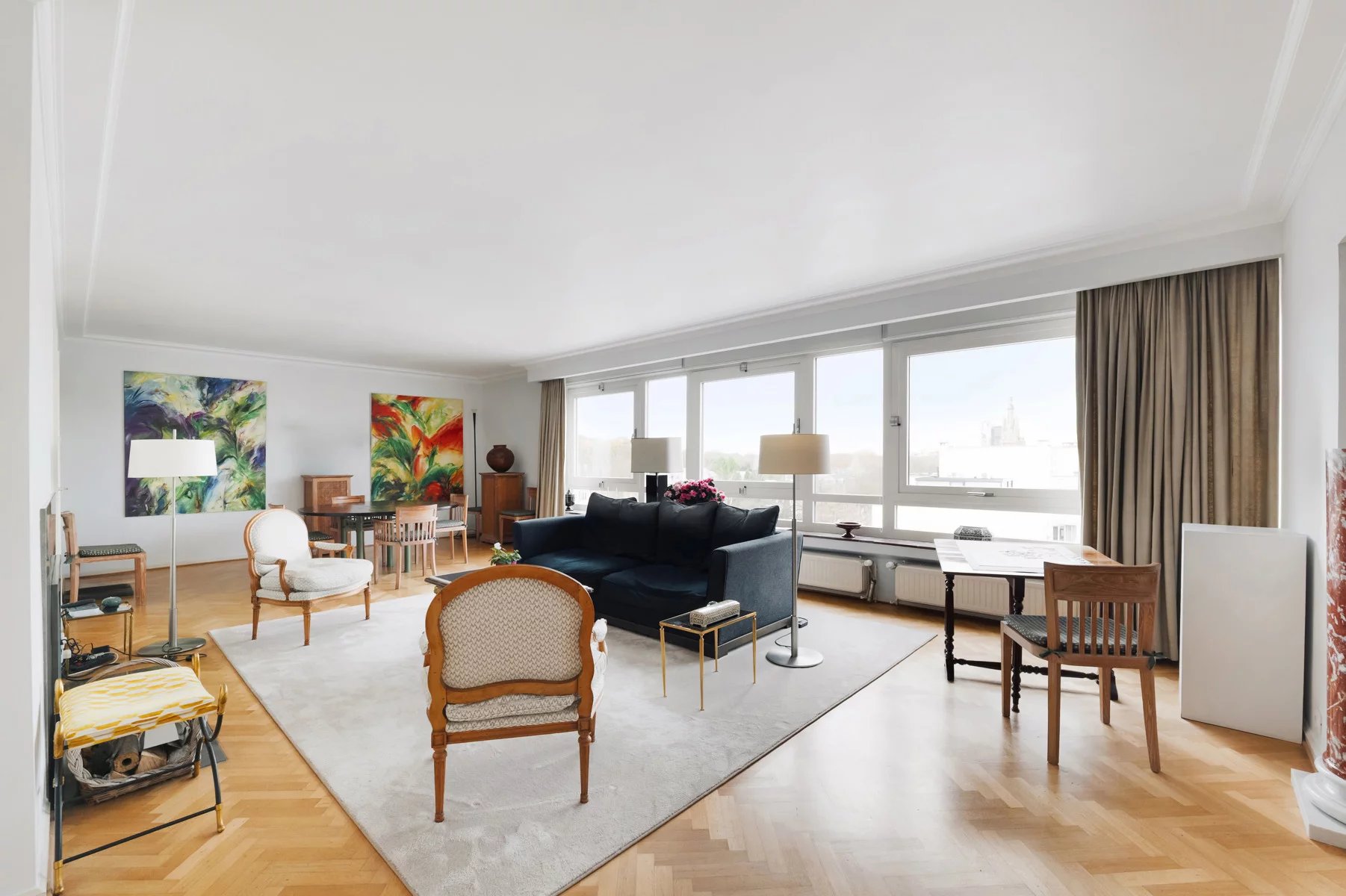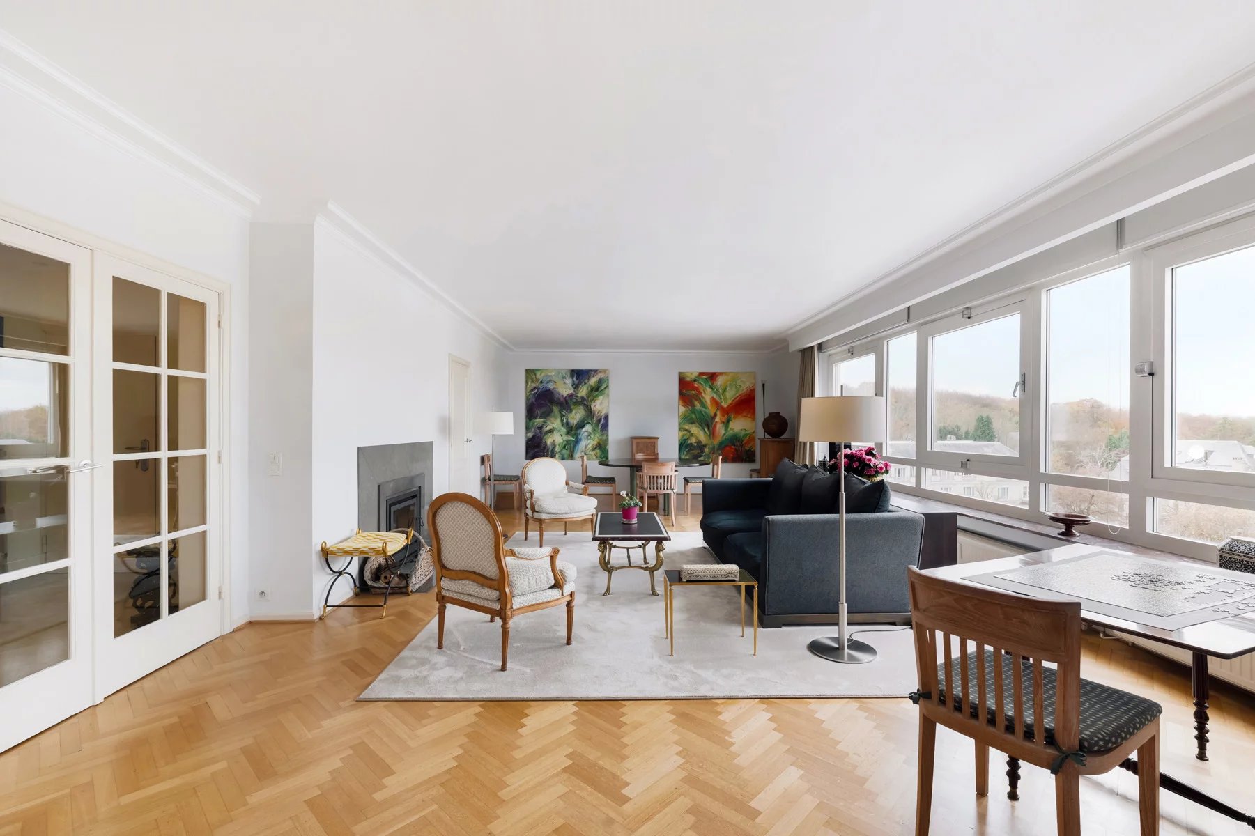 Hall d'entrée en marbre (12m²),porte blindée - vidéophonie Toilette et vestiaire Très belles réceptions (+- 49m²), parquet, FO cassette, superbe vue dégagée vers le Bois de la Cambre, bureau attenant, parquet (14m²) Cuisine super-équipée (10m²) Hall de nuit avec placards Une grande chambre arrière (21m²) accès terrasse et vue dégagée sur le bois, salle de bains attenante avec bain, double lavabo, WC Une chambre , parquet (12m²) accès terrasse Une chambre, parquet (16m²) accès terrasse Salle de douche Volets électriques dans toutes les chambres Cave n° 6 Garage fermé n° 4 dans la cour Quotités pour l'ensemble : 147/1000 ièmes Toiture de l'immeuble isolée Conciergerie sera vendue - acte de base sera refait, la vente de la conciergerie servira à payer les travaux d'isolation de la façade arrière Charges : -communes +- 550 euros/mois tenant compte des charges mensuelles pour la concierge +- 125 euros / mois qui sont retirées (syndic, assurances, ascenseurs, prov chauffage, communs, ....) - privatives eau, gaz électricité +- 285 euros/ mois