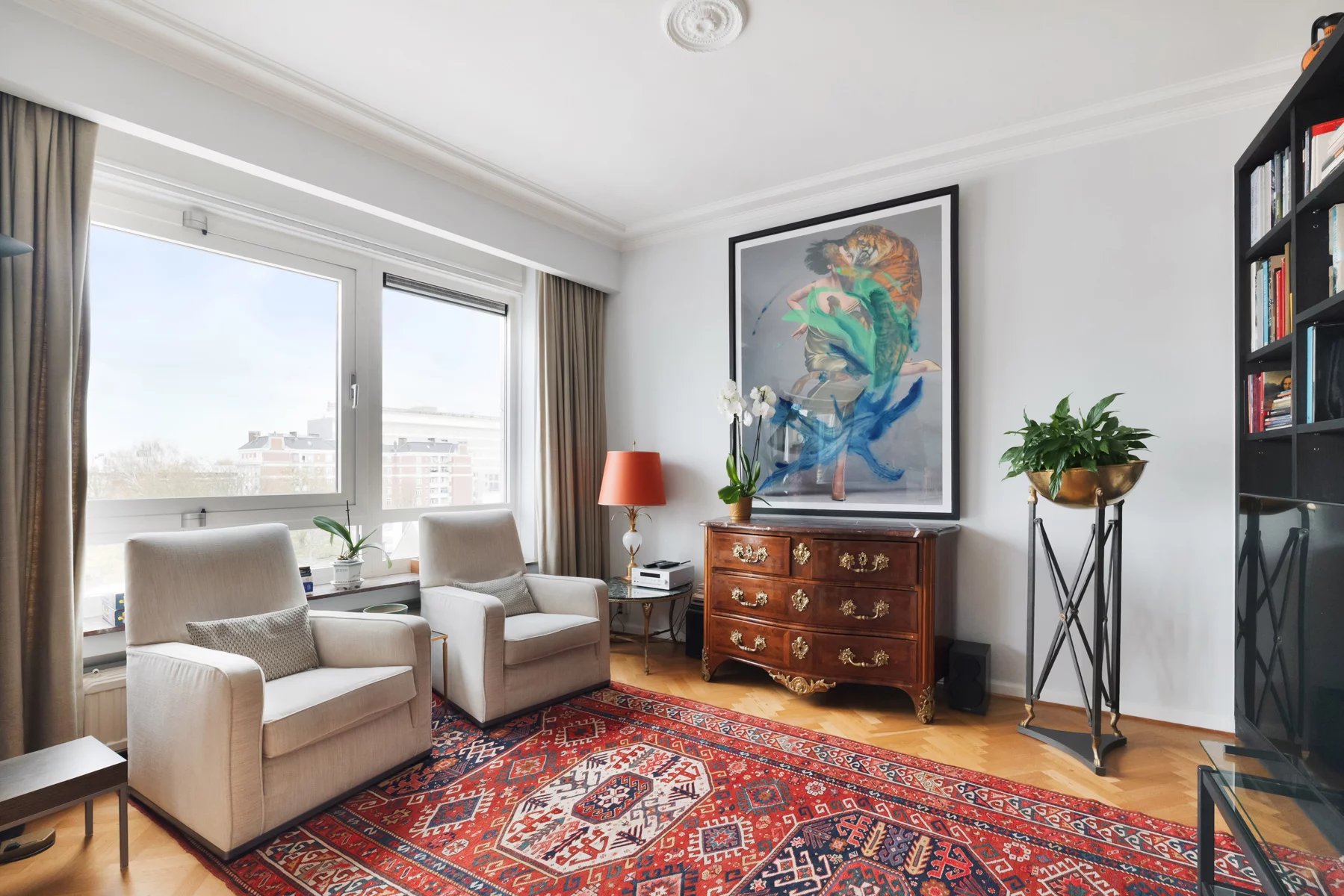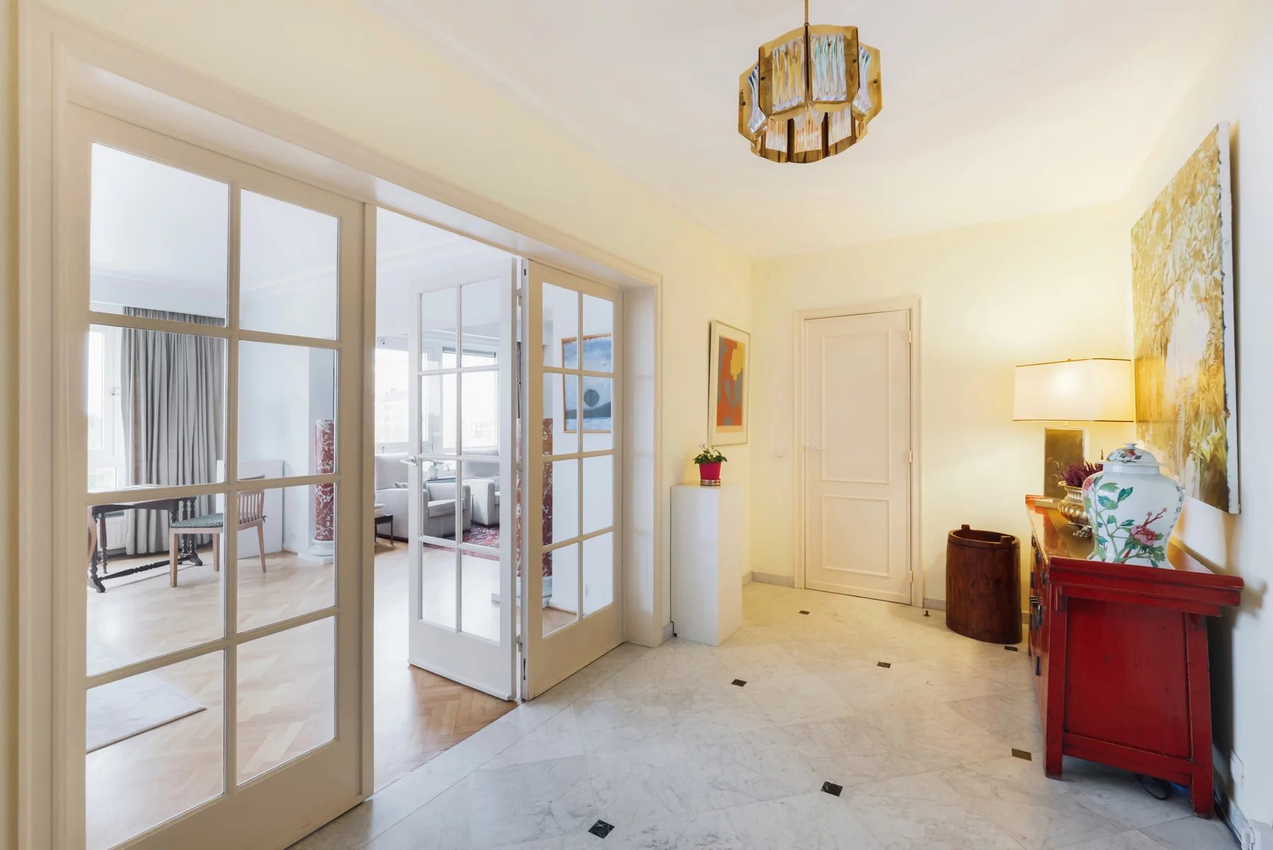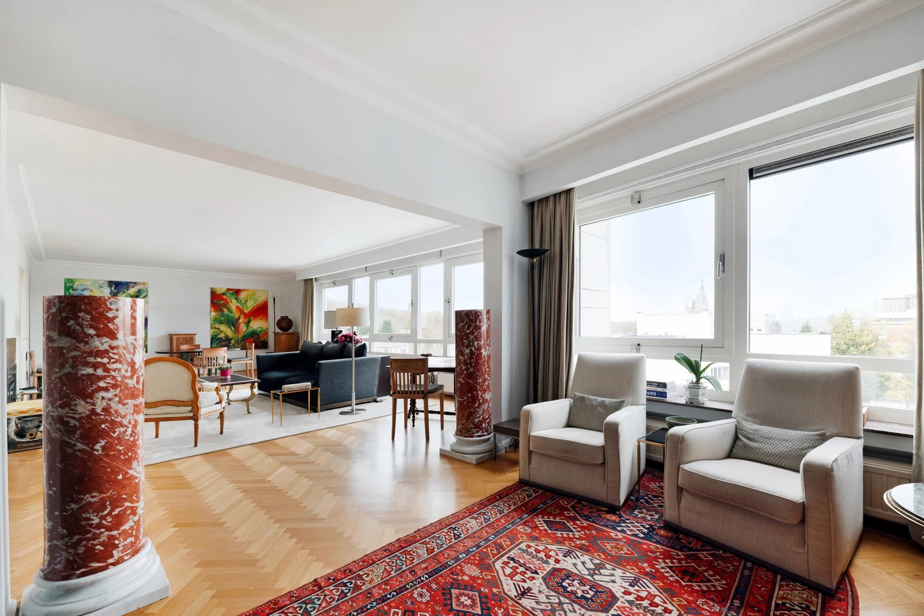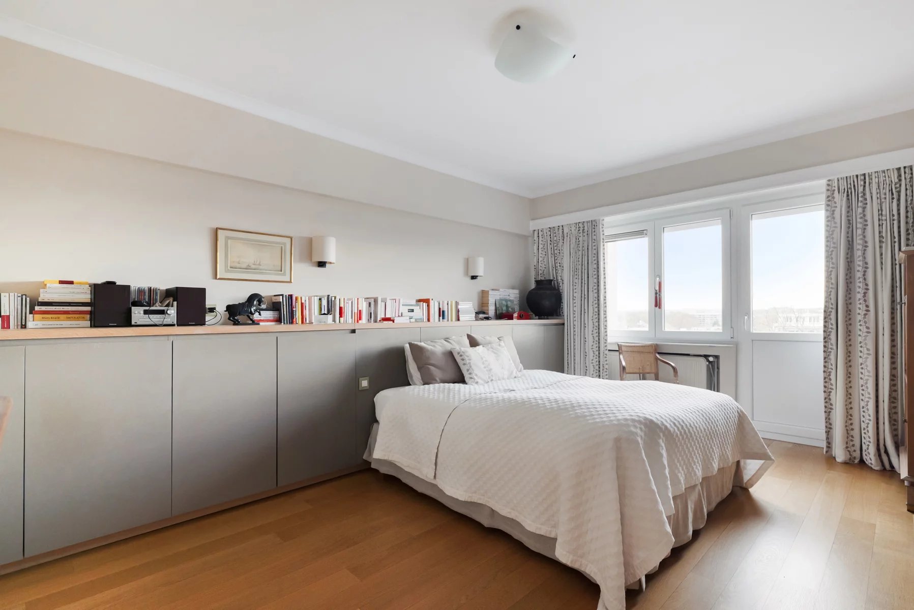 Hall d'entrée en marbre (12m²),porte blindée - vidéophonie Toilette et vestiaire Très belles réceptions (+- 49m²), parquet, FO cassette, superbe vue dégagée vers le Bois de la Cambre, bureau attenant, parquet (14m²) Cuisine super-équipée (10m²) Hall de nuit avec placards Une grande chambre arrière (21m²) accès terrasse et vue dégagée sur le bois, salle de bains attenante avec bain, double lavabo, WC Une chambre , parquet (12m²) accès terrasse Une chambre, parquet (16m²) accès terrasse Salle de douche Volets électriques dans toutes les chambres Cave n° 6 Garage fermé n° 4 dans la cour Quotités pour l'ensemble : 147/1000 ièmes Toiture de l'immeuble isolée Conciergerie sera vendue - acte de base sera refait, la vente de la conciergerie servira à payer les travaux d'isolation de la façade arrière Charges : -communes +- 550 euros/mois tenant compte des charges mensuelles pour la concierge +- 125 euros / mois qui sont retirées (syndic, assurances, ascenseurs, prov chauffage, communs, ....) - privatives eau, gaz électricité +- 285 euros/ mois