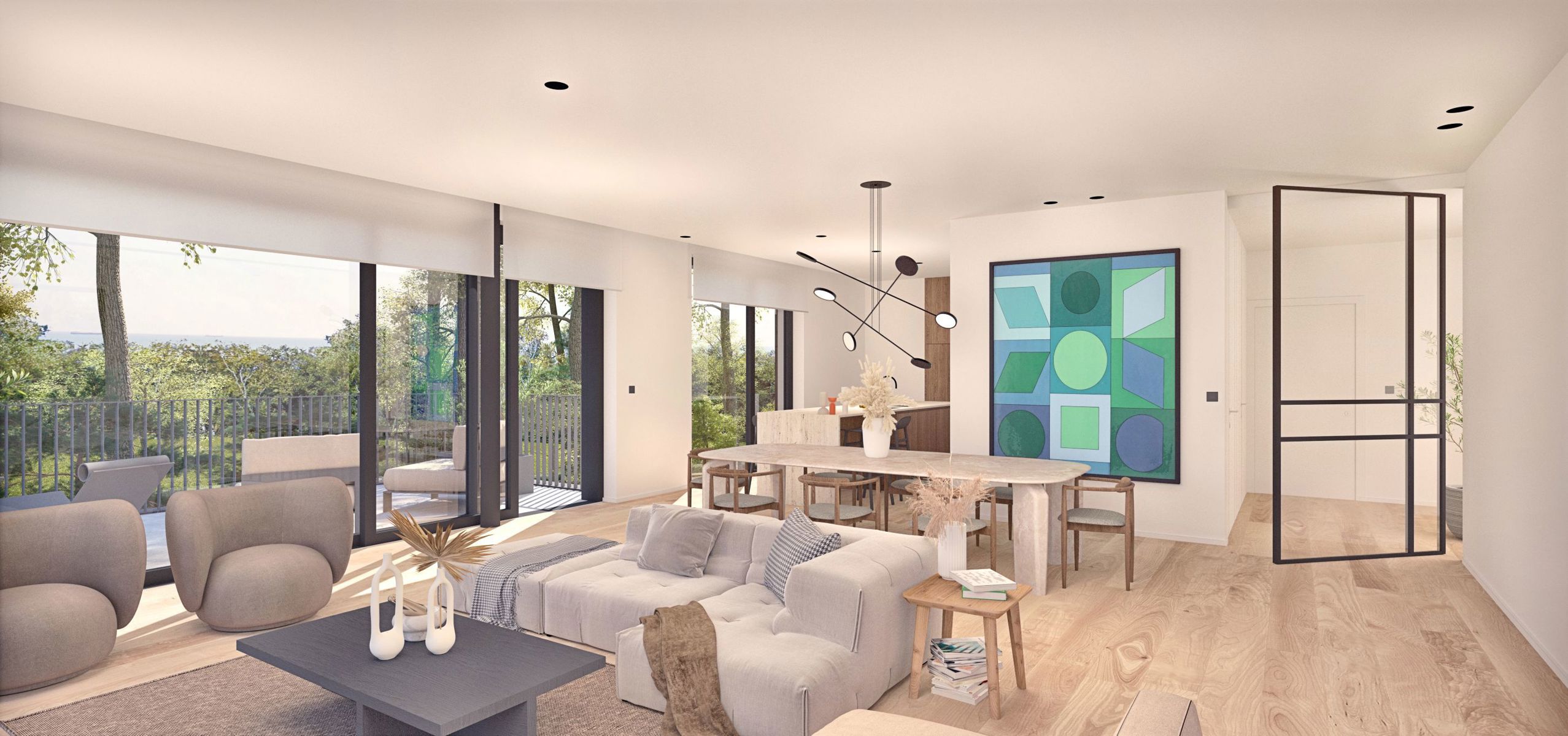 Dit project van twee appartementsvilla's geniet van een bijzonder bevoorrechte locatie in de rustige en gewilde buurt van de Groenejacht, op slechts een steenworp afstand van het Terkamerenbos en de verschillende activiteiten van dit residentiële gebied in Uccle. Victoire-JUNOT biedt hier een prachtig duplex penthouse van 371 m² met terrassen (104 m²), zeer goed gelegen aan de achterkant van het pand in VILLA B, genietend van de ochtendzon. De ruime ingangshal verwelkomt u met een ingebouwde garderobe, een gastentoilet en de technische ruimte (inclusief de wasruimte), evenals een ingang naar de grote prachtig uitgeruste keuken (26,76 m²) en naar 1 slaapkamer met balkon (18,03 m²) met een mooie kleedruimte, en profiterend van een doucheruimte met dubbele wastafel en toilet. De hal leidt vervolgens naar het centrale gedeelte van het appartement met de trap naar de bovenverdieping, waar zich de woonkamer en de eetkamer bevinden (respectievelijk 44,53 m² en 47,67 m²). Een mooi terras van 52,5 m² biedt een prachtige verlenging naar buiten. Twee andere slaapkamers met balkons (respectievelijk 18,9 m² en 12,79 m²) genieten, de ene, van een badkamer met dubbele wastafel en toilet en kleedruimte, en de andere, van een doucheruimte met wastafel. Een uitgestrekte veelzijdige ruimte (67,72 m²), uitgebreid met een tweede terras (51,4 m²), bevindt zich op de bovenverdieping en profiteert van rust en een uitzicht op de voorkant van het pand. Een dubbele parkeerplaats en een kelder zullen beschikbaar zijn als extra, wat extra ruimte en opslagfaciliteiten garandeert. Verkoop onder registratierechten (12,5%) voor het grondgedeelte en onder BTW voor het bouwgedeelte. Voor optimaal comfort zal elk appartement profiteren van een individuele warmtepomp, aangevuld met fotovoltaïsche zonnepanelen, wat een energieprestatieklasse A garandeert.